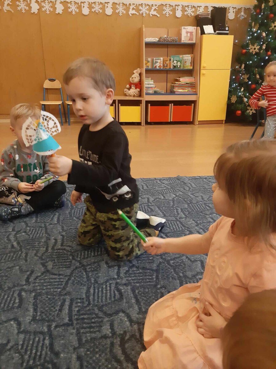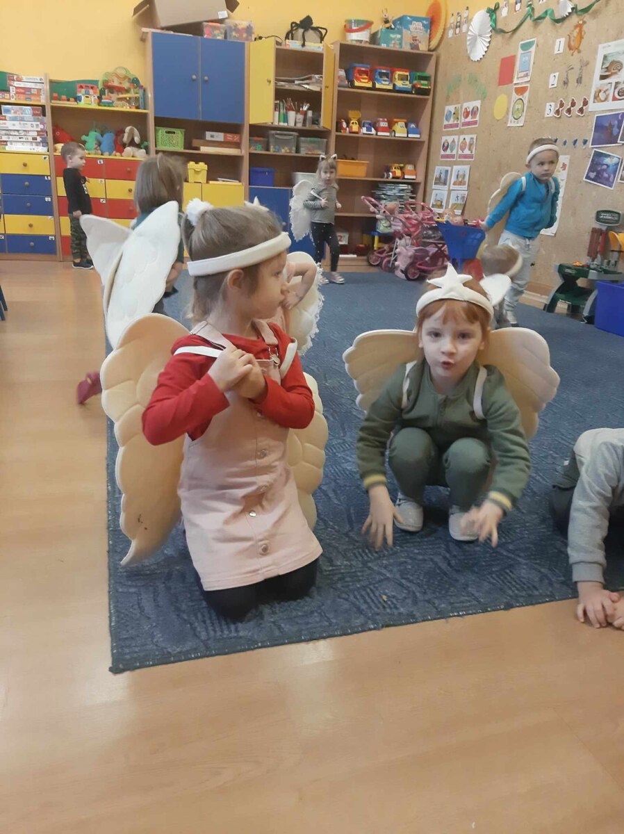 ,,Aniołek” nierozerwalnie związany jest ze Świętami Bożego Narodzenia, dlatego dzieci z gr. I chętnie zamieniły się w aniołki. Cały dzień mogły ,,fruwać” dzięki skrzydełkom. Podczas zabawy wysłuchały opowiadania pt.: „Aniołkowy prezent”. Zgadywały, co robią aniołki w niebie, opisywały je, tańczyły aniołkowe tańce, nauczyły się krótkiej piosenki z pokazywaniem, malowały chmurki i aniołka, wspólnie bawiły się w wyciszającą zabawę integracyjną do muzyki pt.: „Wędrujący aniołek”.