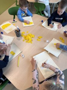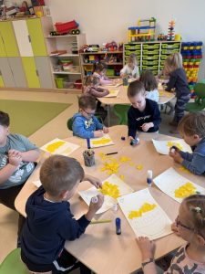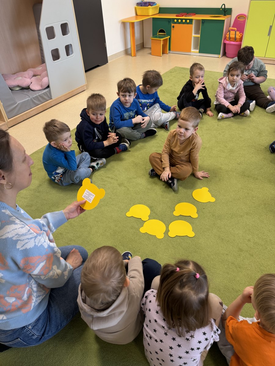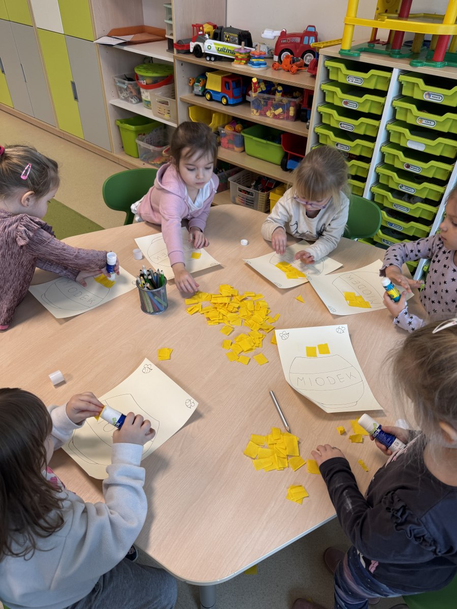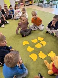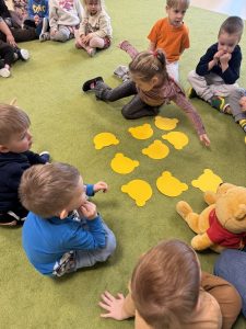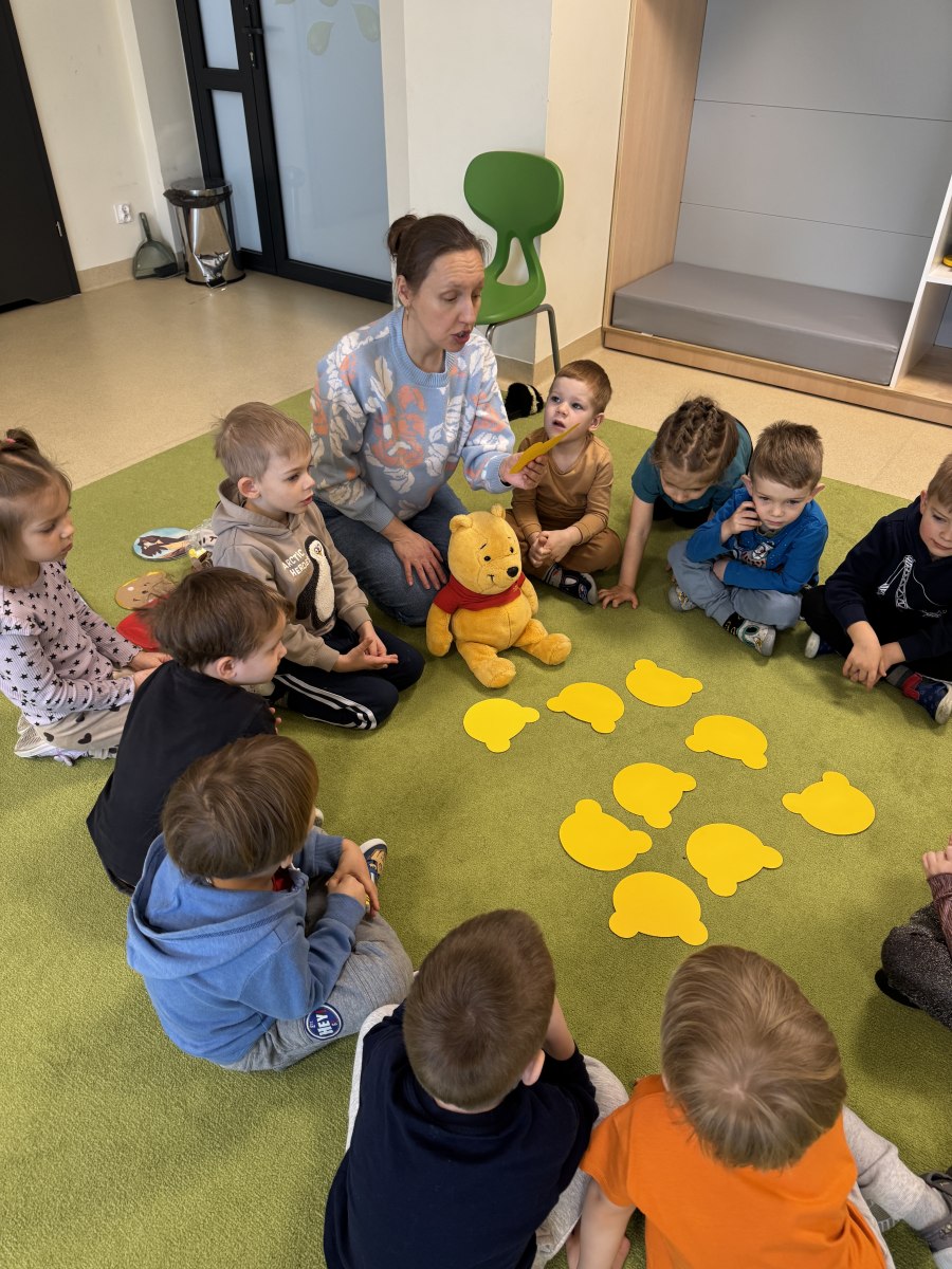 Następnie Biedronki wykonały pracę plastyczną – „miodzik Kubusia Puchatka”, rozwijając swoją kreatywność i sprawność manualną. Na zakończenie spotkania czekała na dzieci pełna radości zabawa ruchowa – przekazywanie piłeczki za pomocą spinaczy, która dostarczyła mnóstwo śmiechu i pozytywnych emocji.