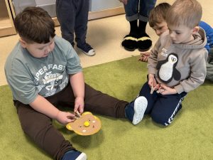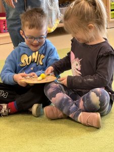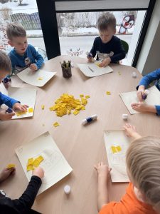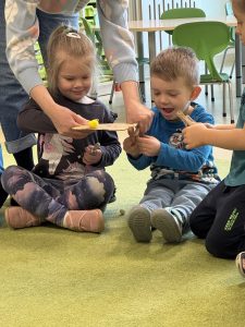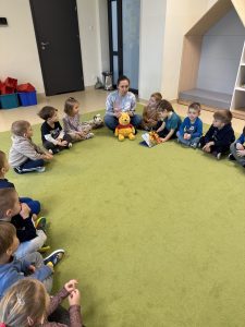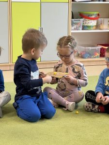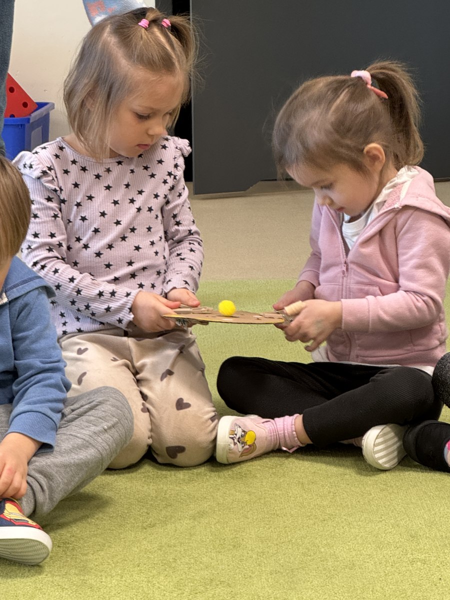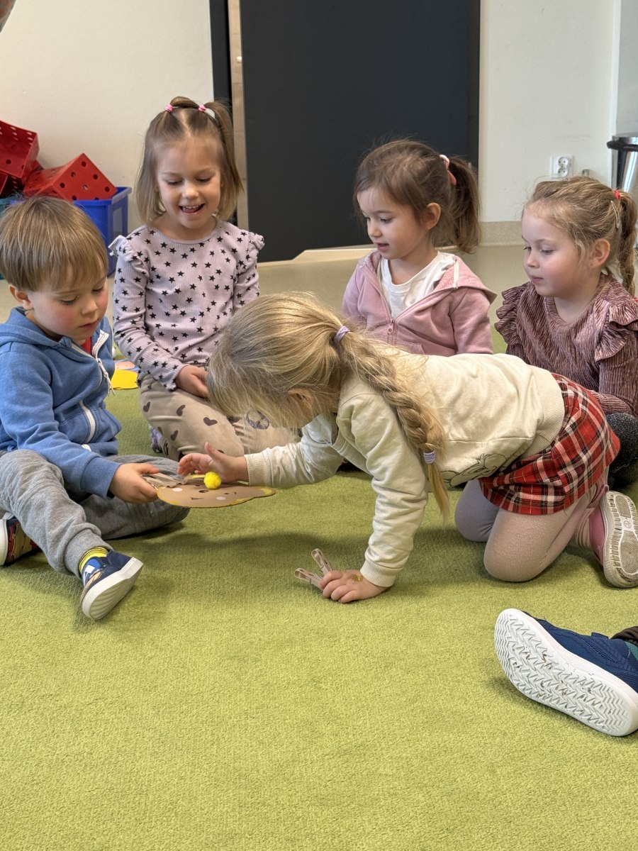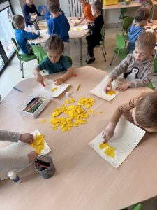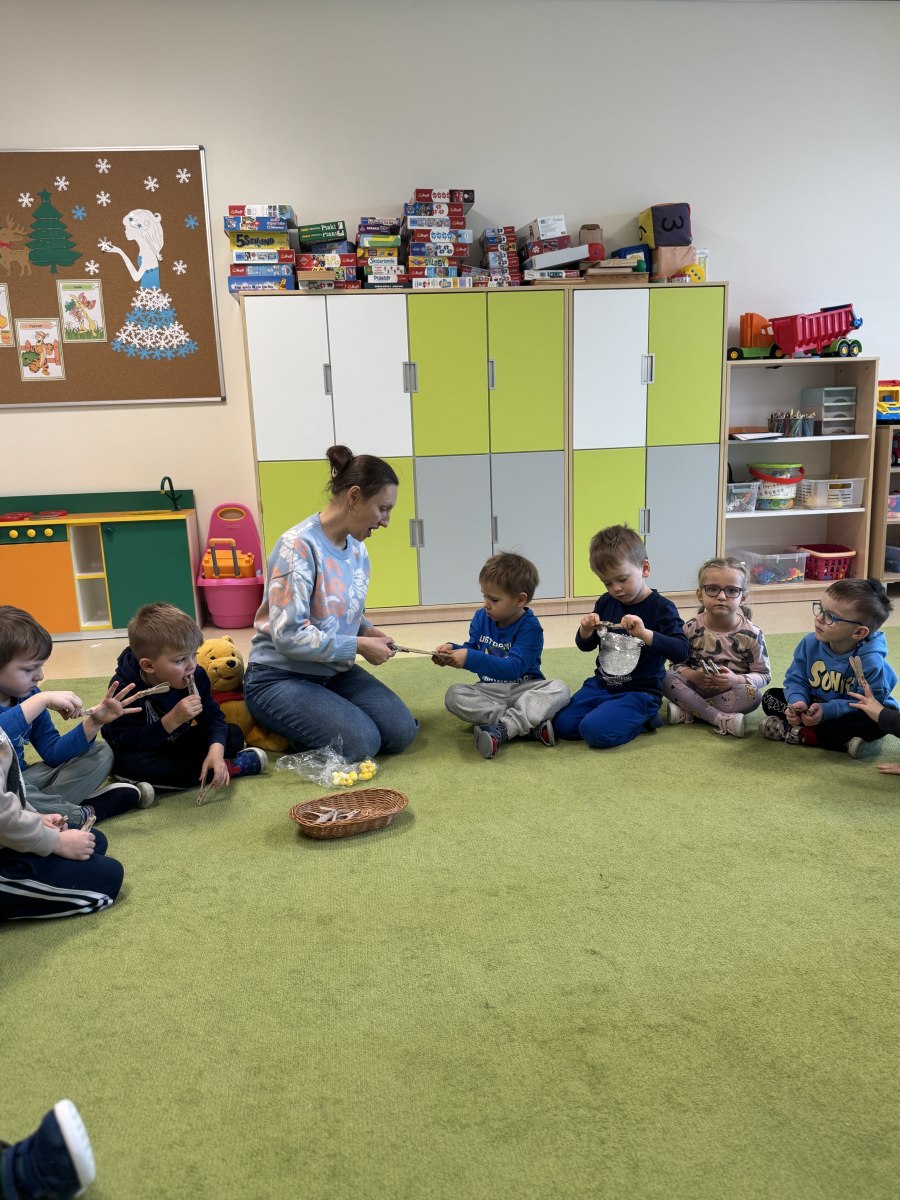 Następnie Biedronki wykonały pracę plastyczną – „miodzik Kubusia Puchatka”, rozwijając swoją kreatywność i sprawność manualną. Na zakończenie spotkania czekała na dzieci pełna radości zabawa ruchowa – przekazywanie piłeczki za pomocą spinaczy, która dostarczyła mnóstwo śmiechu i pozytywnych emocji.
