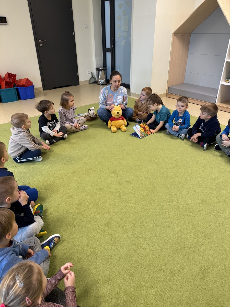 Przedszkolaki z zaciekawieniem wysłuchały pięknej historii o Kubusiu Puchatku, która przeniosła je do Stumilowego Lasu i wprowadziła w świat przyjaźni, życzliwości i dobrej zabawy. Nie zabrakło również wesołych zagadek, z którymi dzieci świetnie sobie poradziły, wykazując się doskonałą znajomością bajkowych bohaterów.