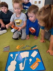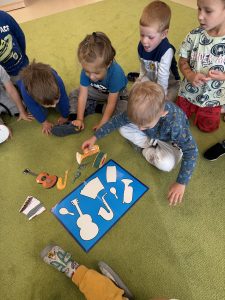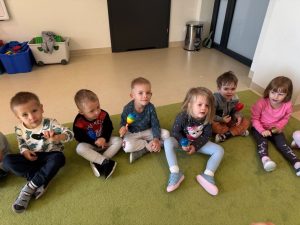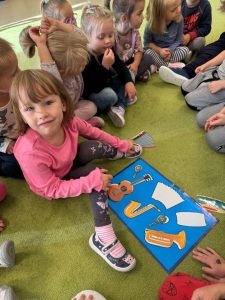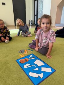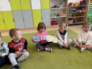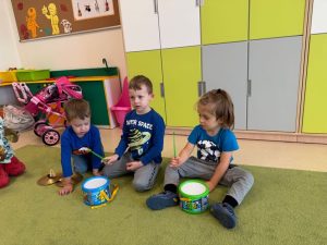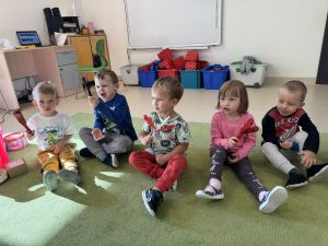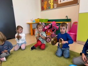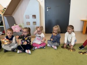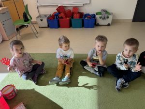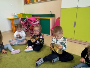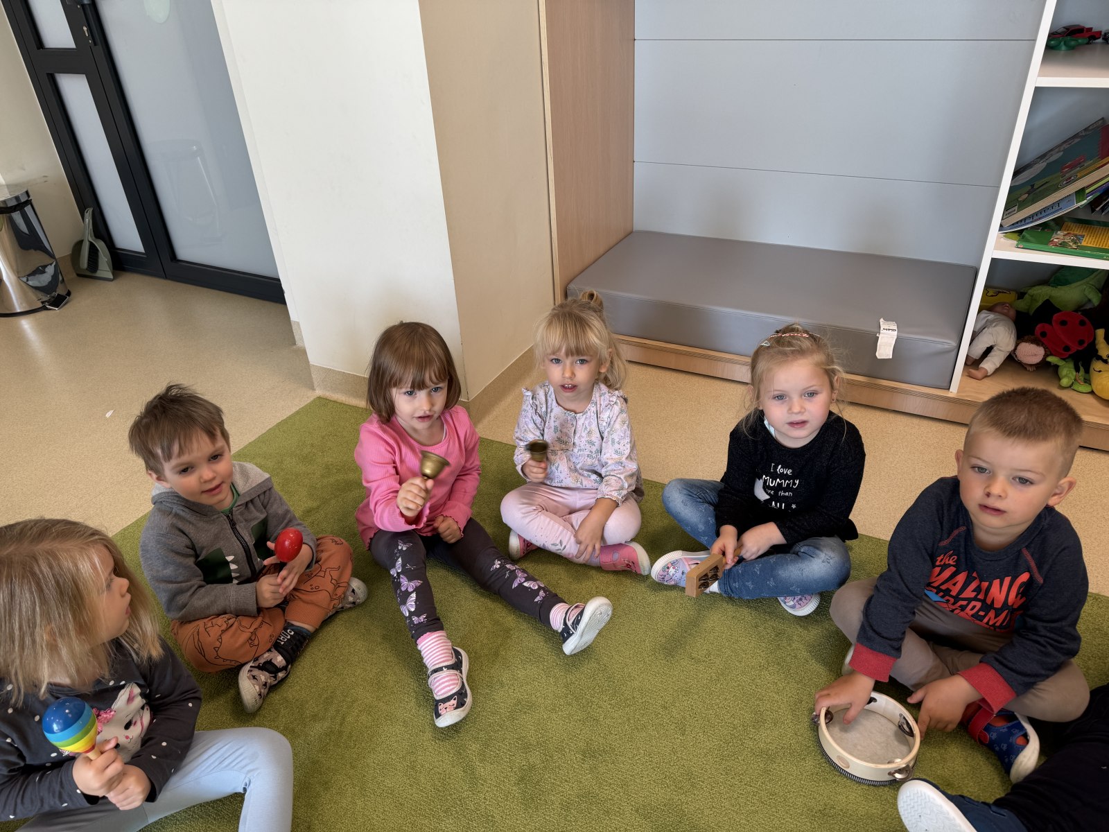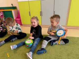 Podczas zajęć rytmicznych pani Sabinka zagrała wspólnie z dziećmi piosenkę z wykorzystaniem instrumentów, co sprawiło im ogromną radość.