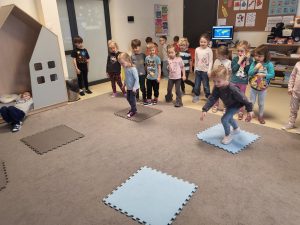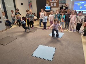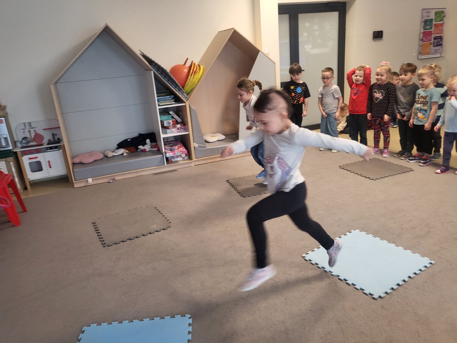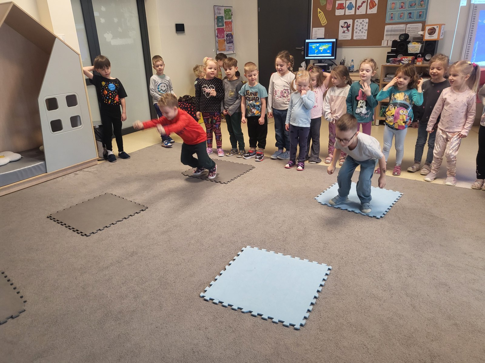 Przedszkolaki uczestniczyły w „niedźwiedziowych” zabawach ruchowych: czesanie futra, skakanie po krze, chodzenie na czworaka.