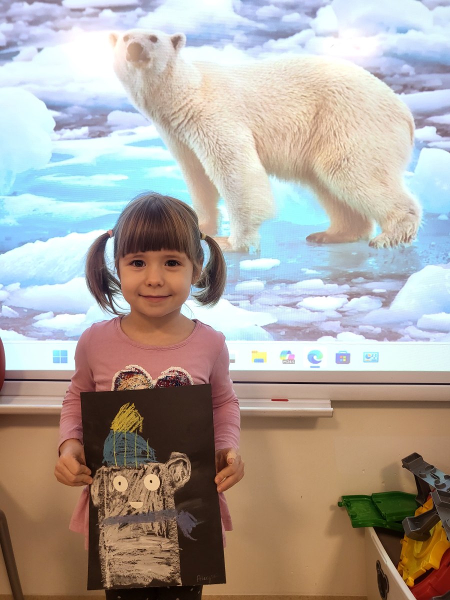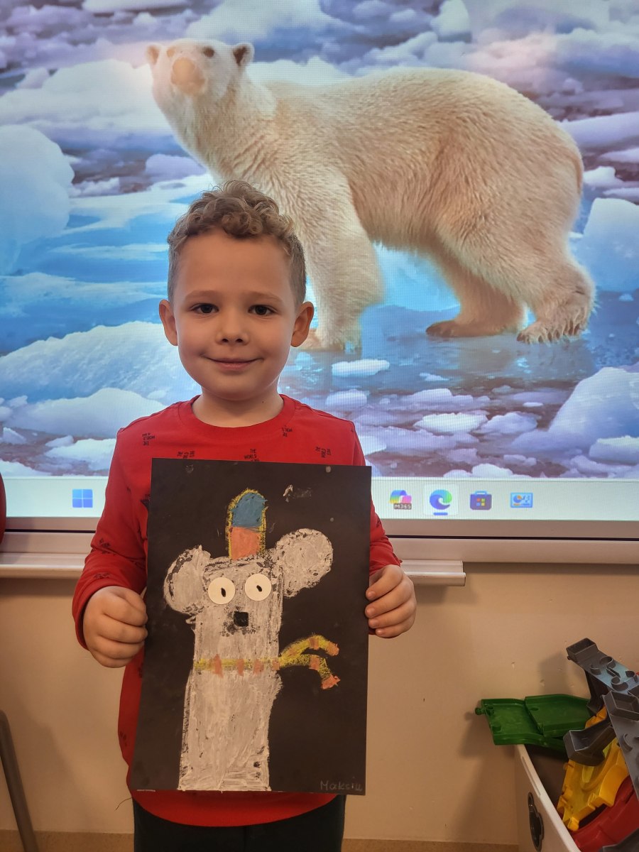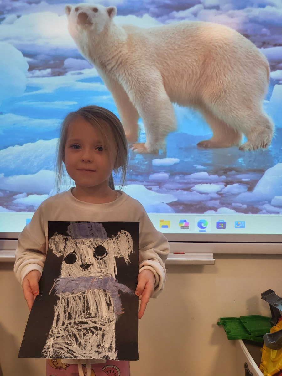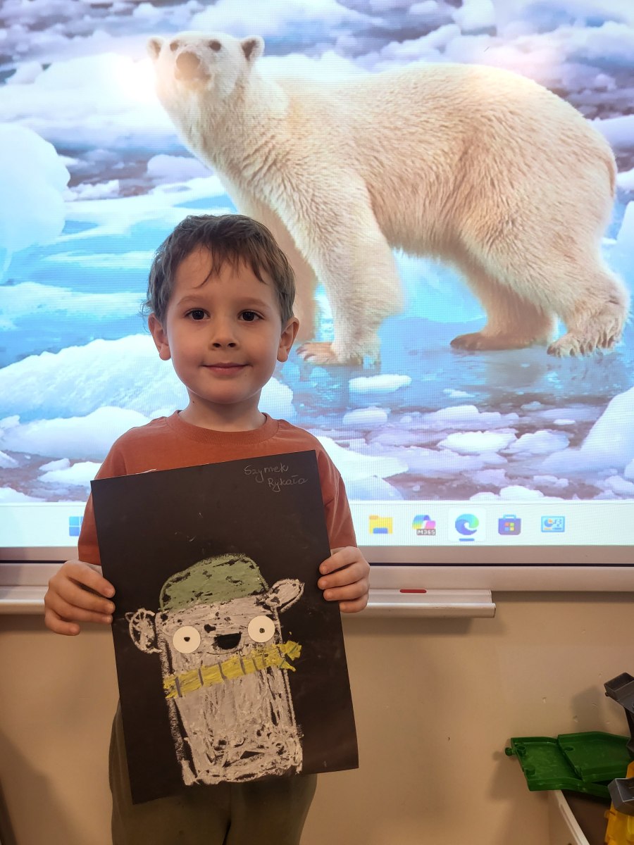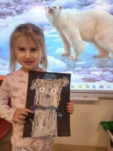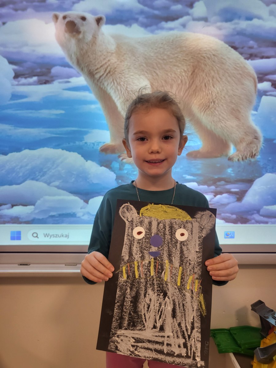 „Pszczółki” wykonały także pracę plastyczną „Miś Polarny”, która była zadaniem styczniowym w ramach projektu edukacyjnego „Kreatywne Prace Plastyczne”. Polegała ona na kolorowaniu sylwety misia zwilżoną kredą na ciemnym tle. Wszystkie Misie polarne wyszły pięknie i oryginalnie.