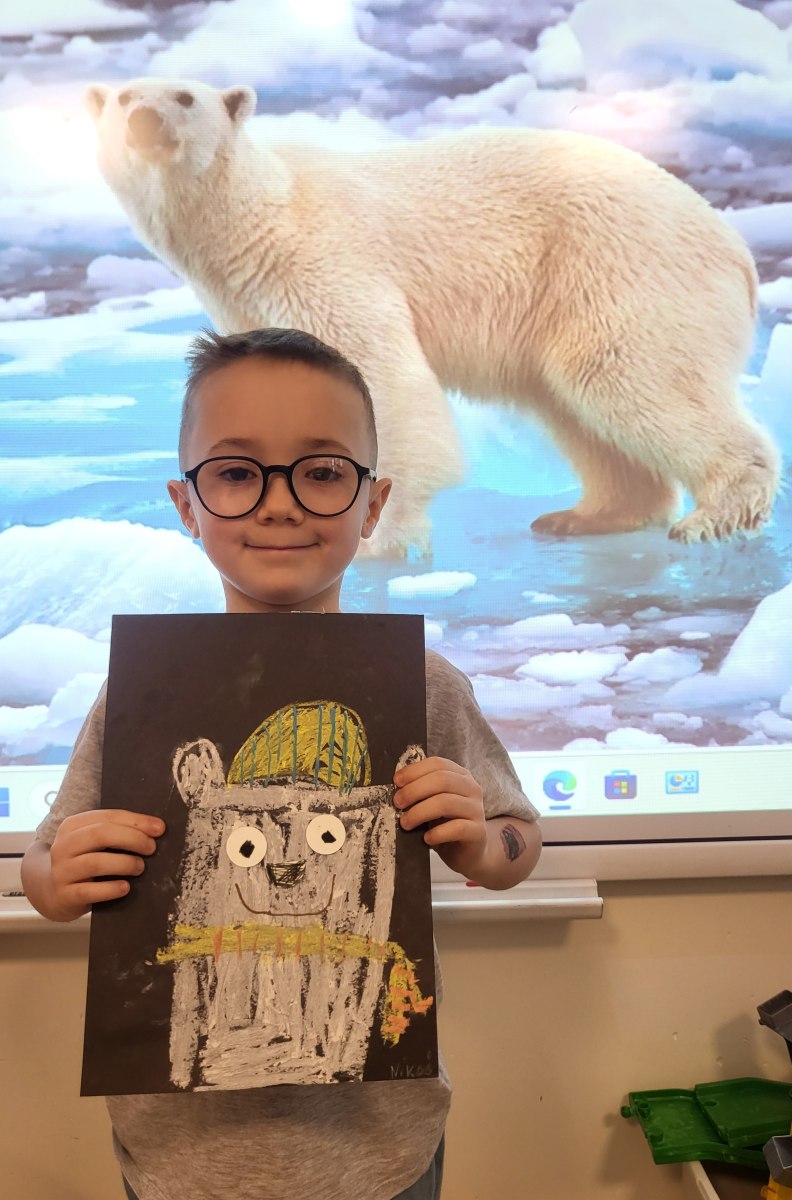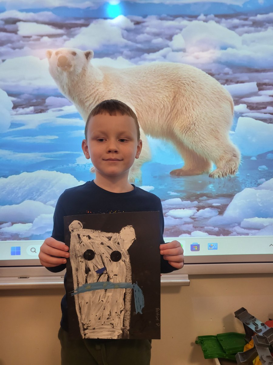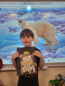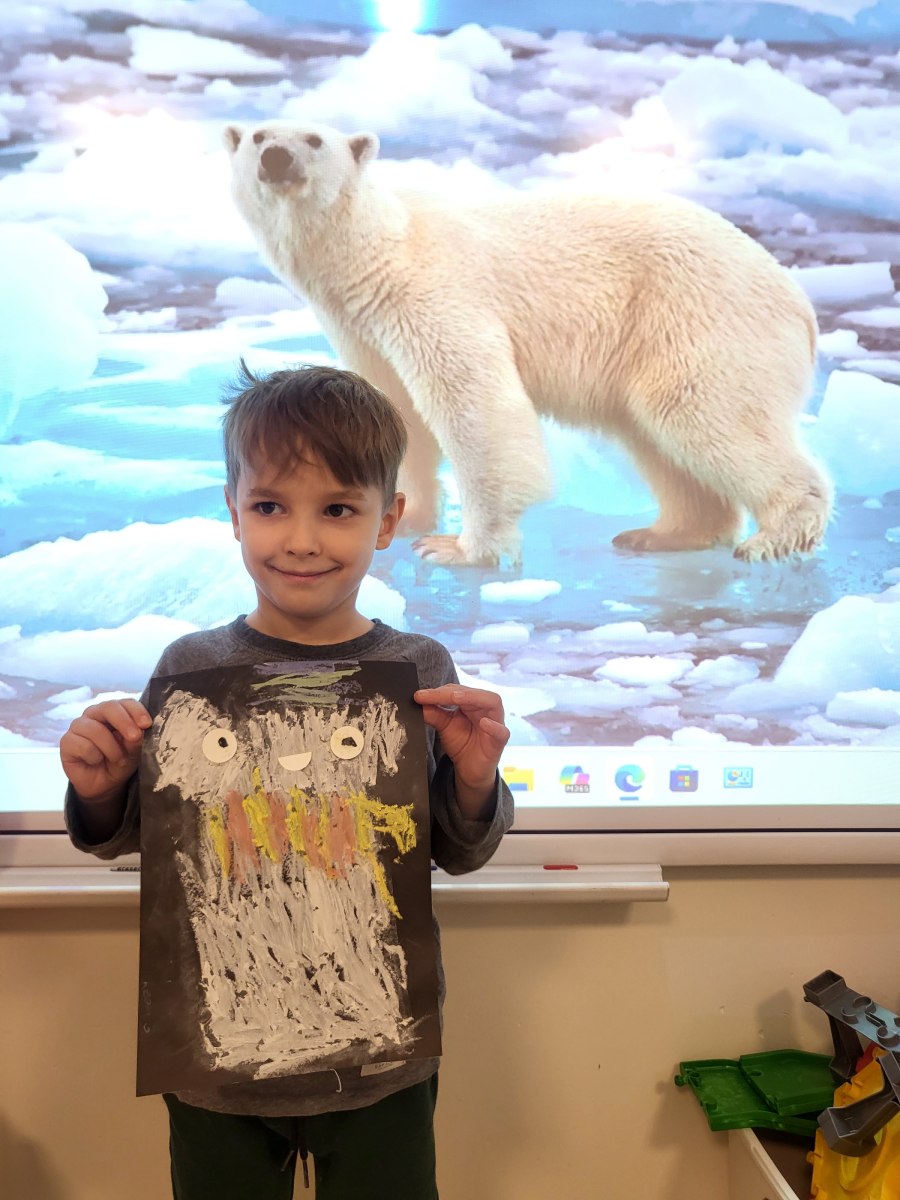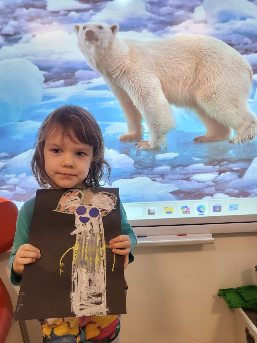 „Pszczółki” wykonały także pracę plastyczną „Miś Polarny”, która była zadaniem styczniowym w ramach projektu edukacyjnego „Kreatywne Prace Plastyczne”. Polegała ona na kolorowaniu sylwety misia zwilżoną kredą na ciemnym tle. Wszystkie Misie polarne wyszły pięknie i oryginalnie.