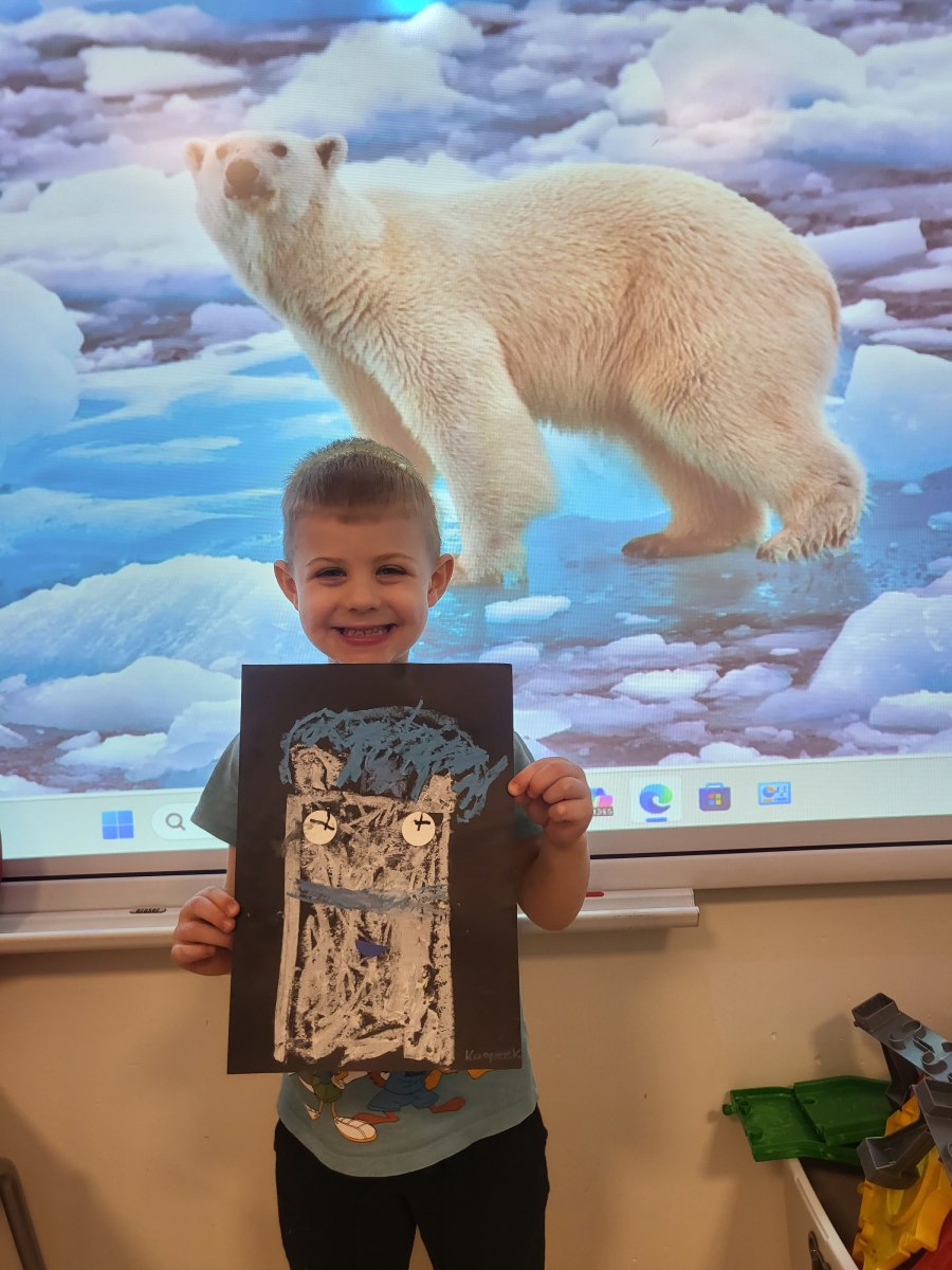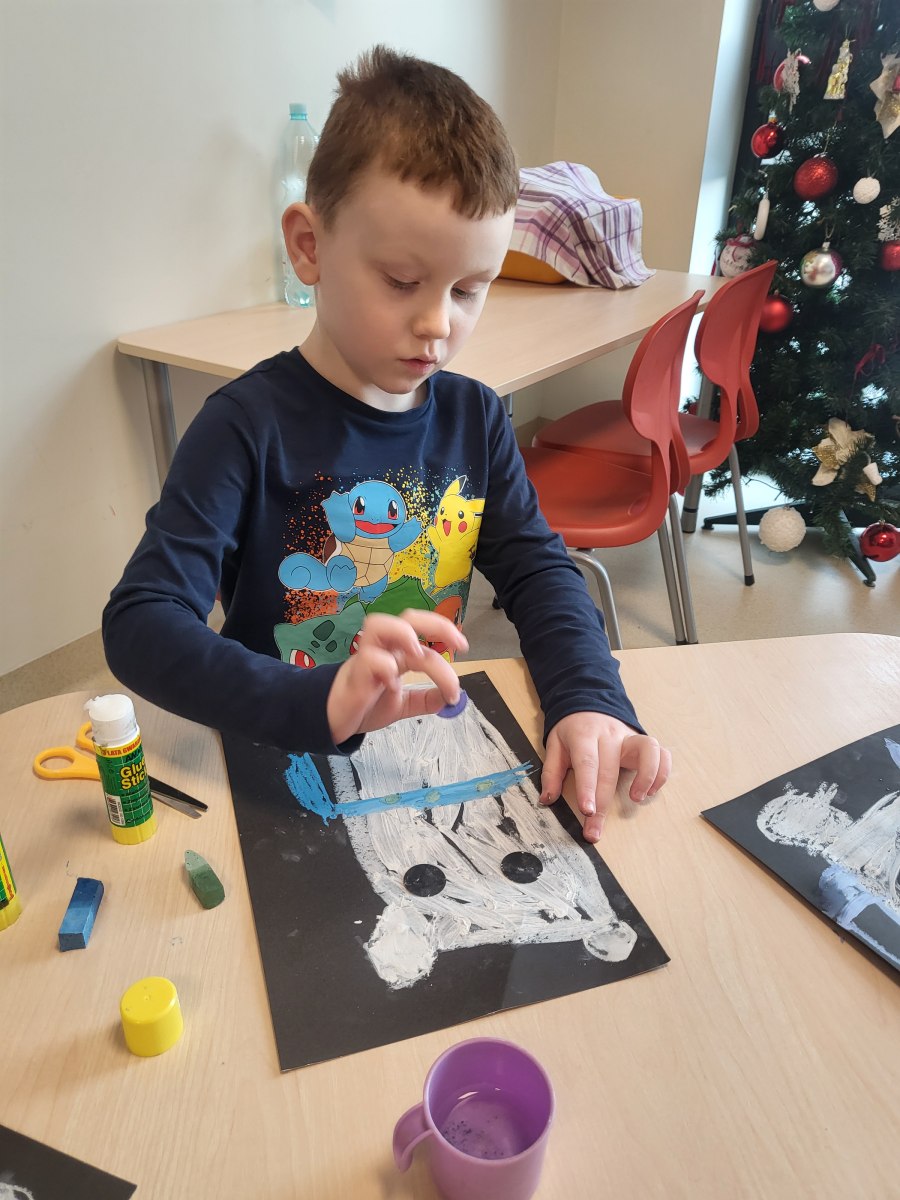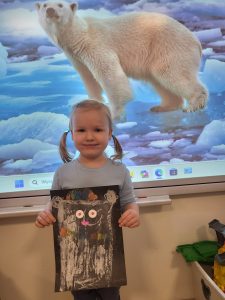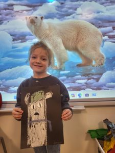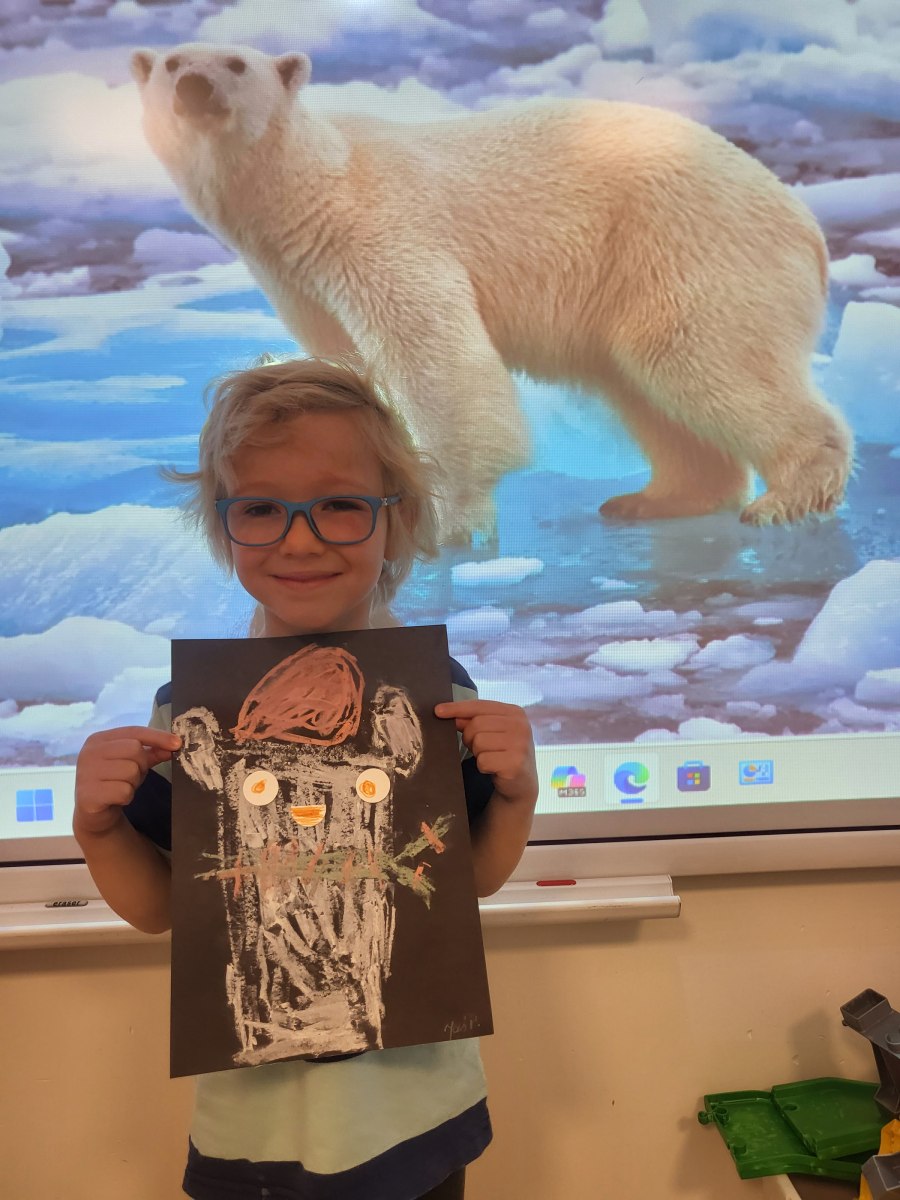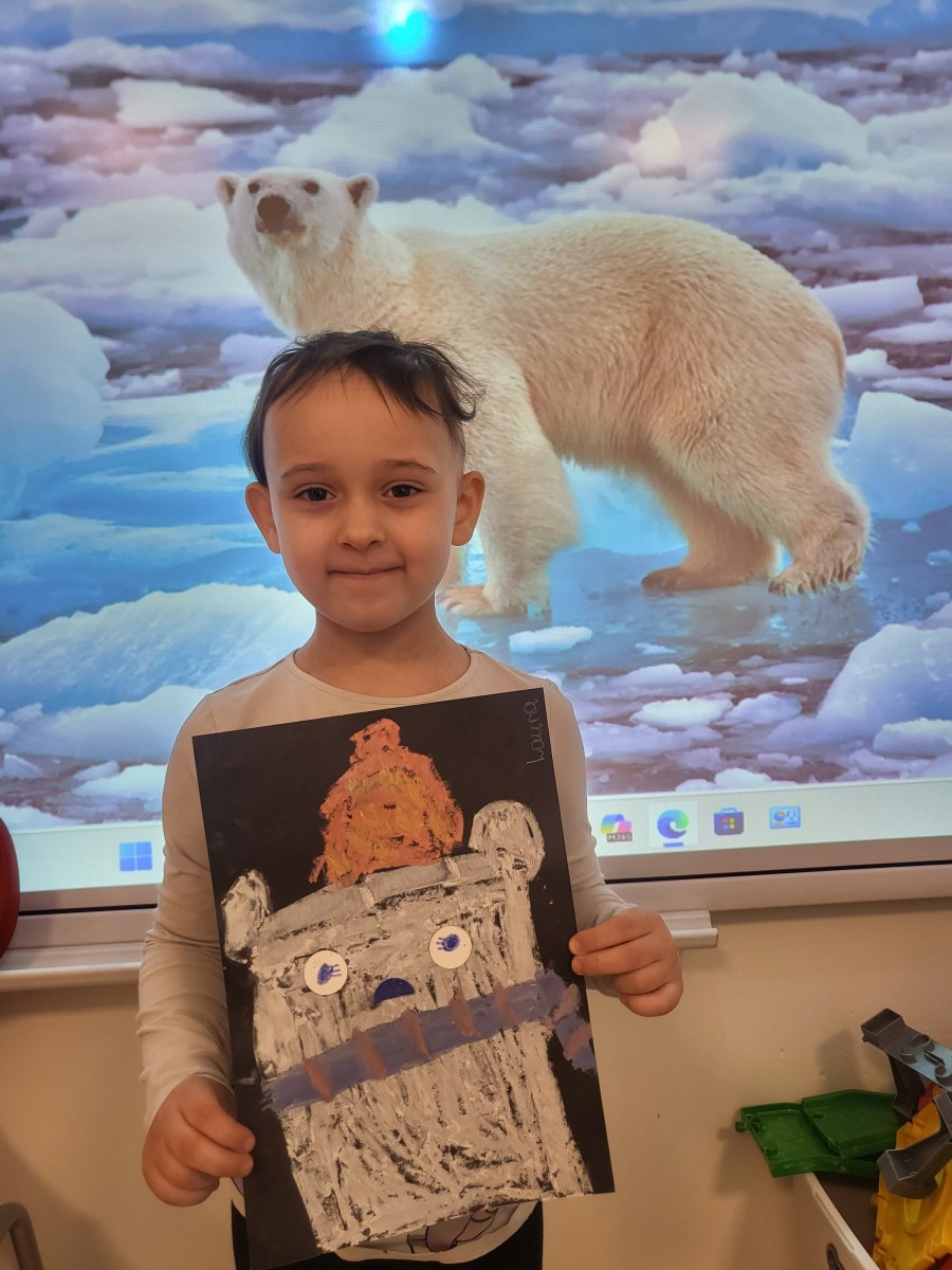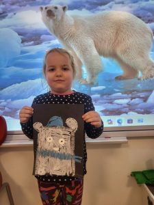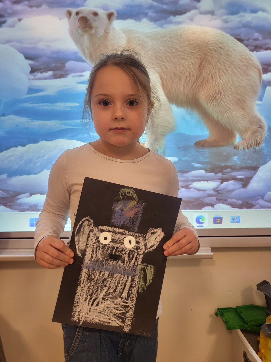 „Pszczółki” wykonały także pracę plastyczną „Miś Polarny”, która była zadaniem styczniowym w ramach projektu edukacyjnego „Kreatywne Prace Plastyczne”. Polegała ona na kolorowaniu sylwety misia zwilżoną kredą na ciemnym tle. Wszystkie Misie polarne wyszły pięknie i oryginalnie.