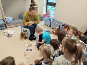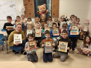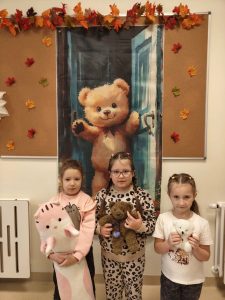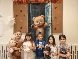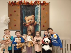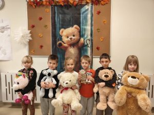 25 listopada świętowaliśmy ,,Dzień Pluszowego Misia” w grupie Sówek. Do naszej sali przyszła Pani Sabinka z biblioteki na ul. Gromskiego. Opowiedziała dzieciom o Dniu Misia i przeczytała książkę pt: ,,Ubierzemy Misia”. Dzieci z chęcią pomagały ubrać misia w odpowiedni strój podczas czytania np. Miś – marynarz. Następnie przedszkolaki rozwiązywały quiz o misiach. Zatańczyły do muzyki taniec ,,Misie dwa”. Na koniec zajęć dydaktycznych ,,Sówki” wykonały pracę plastyczną ,,Miś” oraz zostały zrobione pamiątkowe zdjęcia.