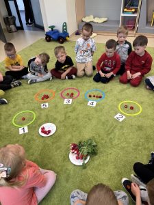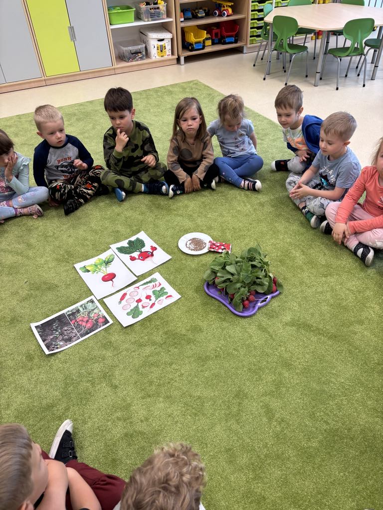 Dzieci z zainteresowaniem oglądały nasiona rzodkiewki, a następnie mogły spróbować jej świeżego, chrupiącego smaku. Były też zabawy edukacyjne – m.in. liczenie rzodkiewek, co sprawiło wszystkim mnóstwo radości i ćwiczyło spostrzegawczość. Nie zabrakło również części artystycznej! Przedszkolaki stworzyły piękne prace plastyczne, używając rzodkiewki jako pieczątek, a także kolorowały tematyczne obrazki. ![]()