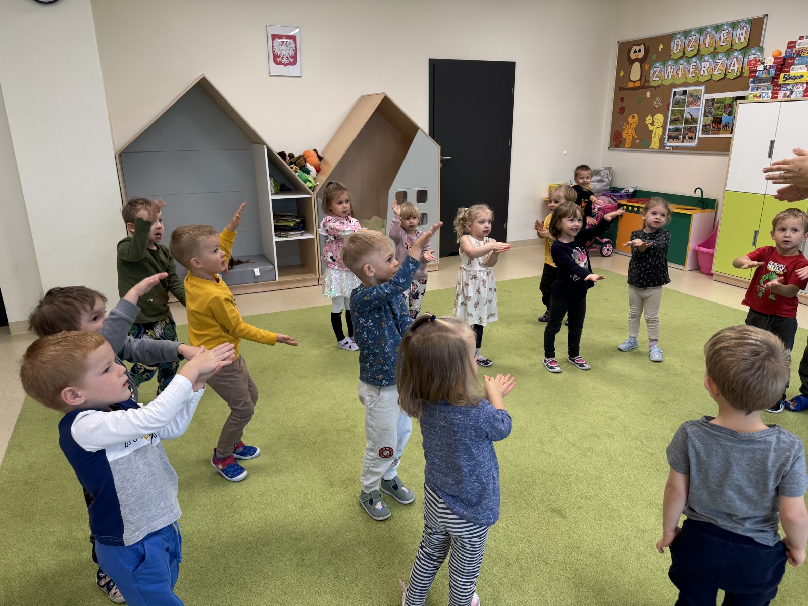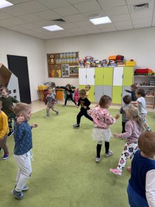 Podczas zajęć rytmicznych u pani Sabinki przedszkolaki bawiły się w różne zwierzątka — poruszały się w rytm muzyki, naśladowały sposób chodzenia i charakterystyczne zachowania różnych gatunków. Nie zabrakło także zabawy w odgadywanie i naśladowanie dźwięków zwierząt, co dostarczyło dzieciom mnóstwo śmiechu i radości.