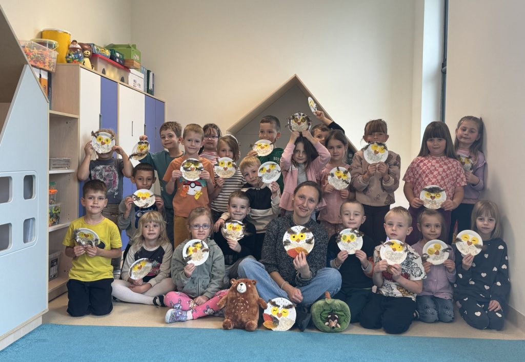 Na zakończenie zajęć przyszedł czas na twórcze działania plastyczne. Wykorzystując m.in. kartki z przestarzałych książek bibliotecznych, każde dziecko stworzyło własną sówkę.