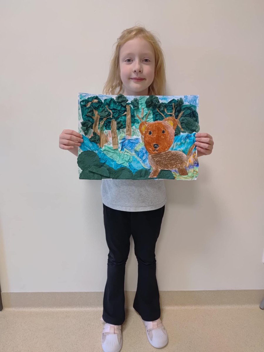 MAJA, ALA i JULIA z grupy Jeżyków wzięły udział w Wojewódzkim Konkursie Plastycznym pt. ,,Św. Hubert wzorem współczesnego ekologa” Tegoroczny temat przypisany do naszej kategorii wiekowej to: ,,Leśne źródło – kto tu zagląda?”