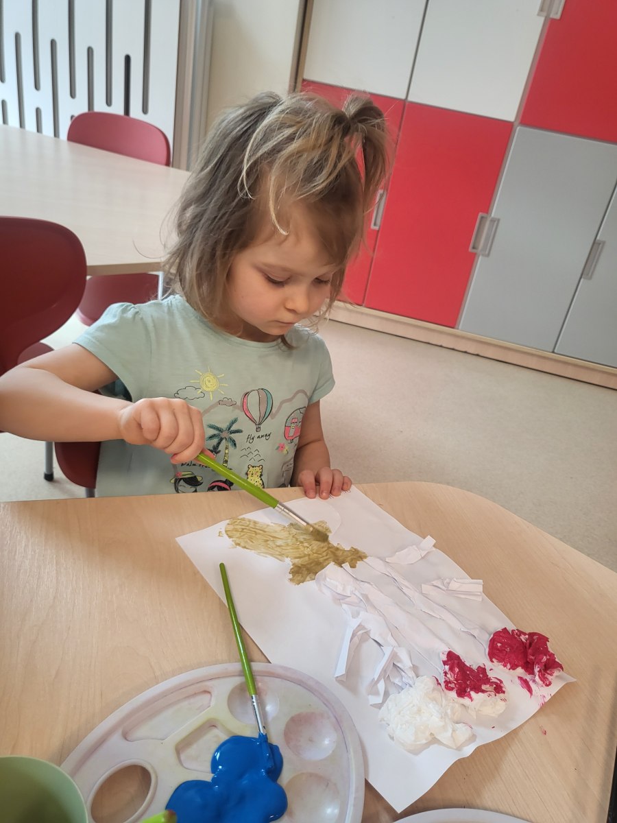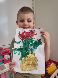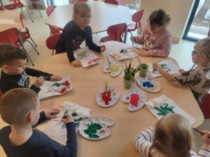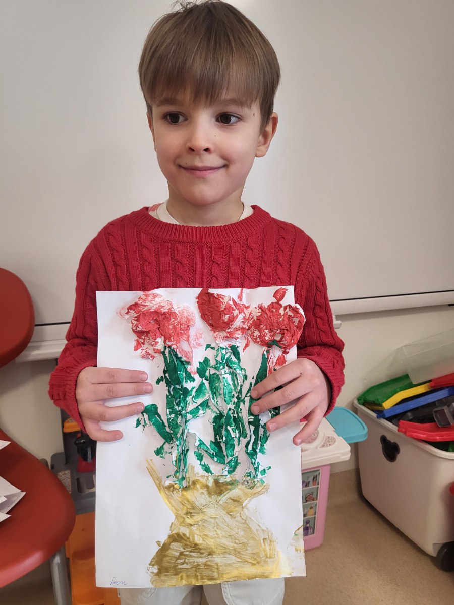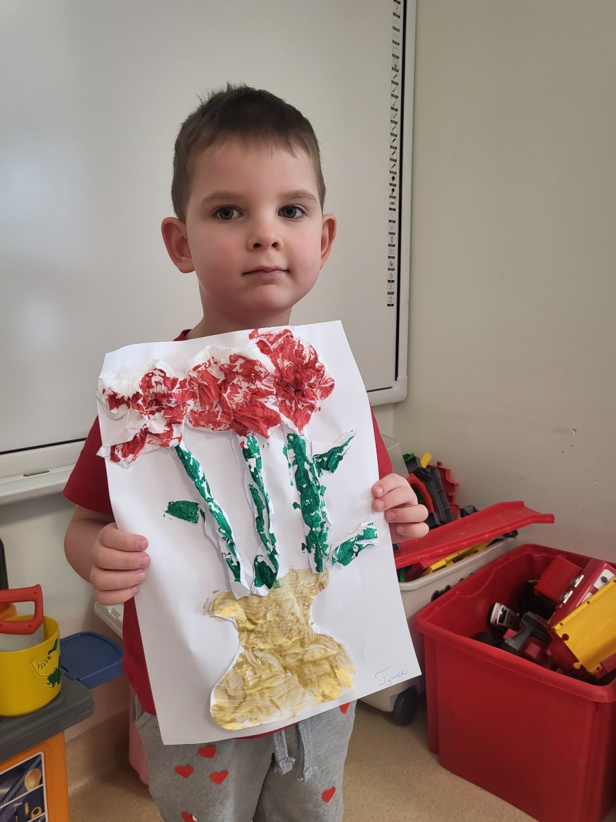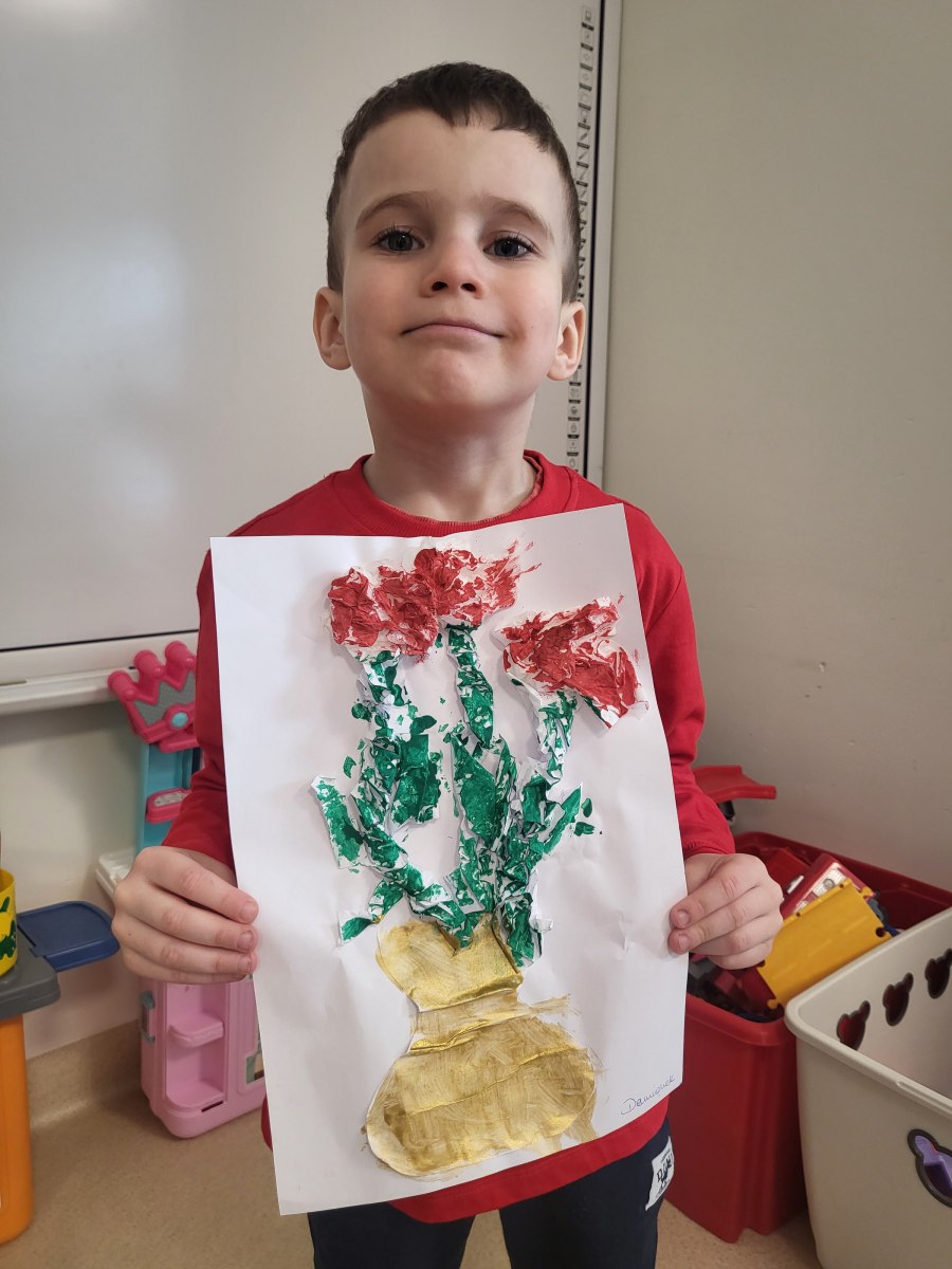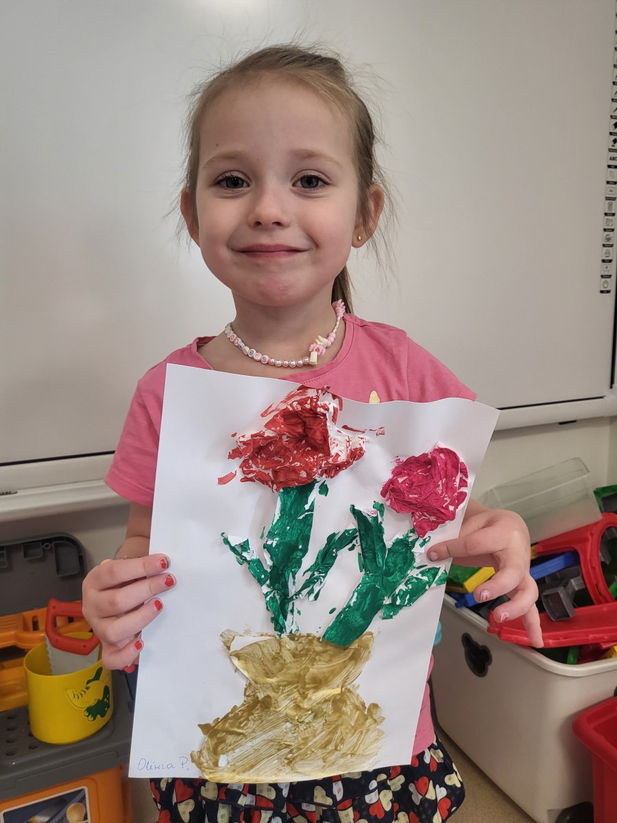 Każde dziecko pracowicie wykleiło róże i pomalowało na wybrane kolory. Wszystkie prace wyszły przepięknie !