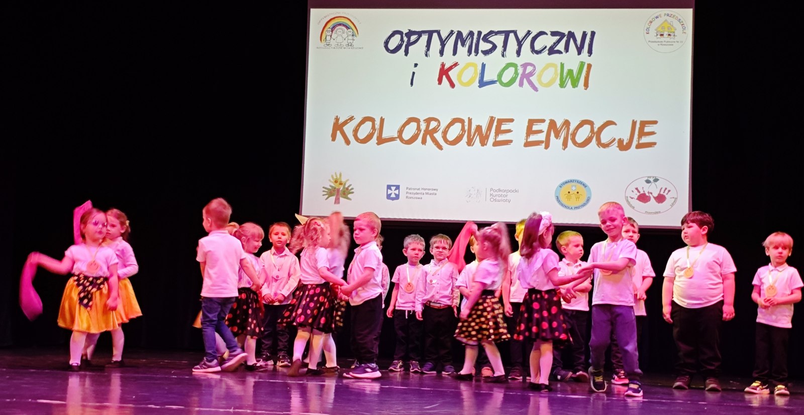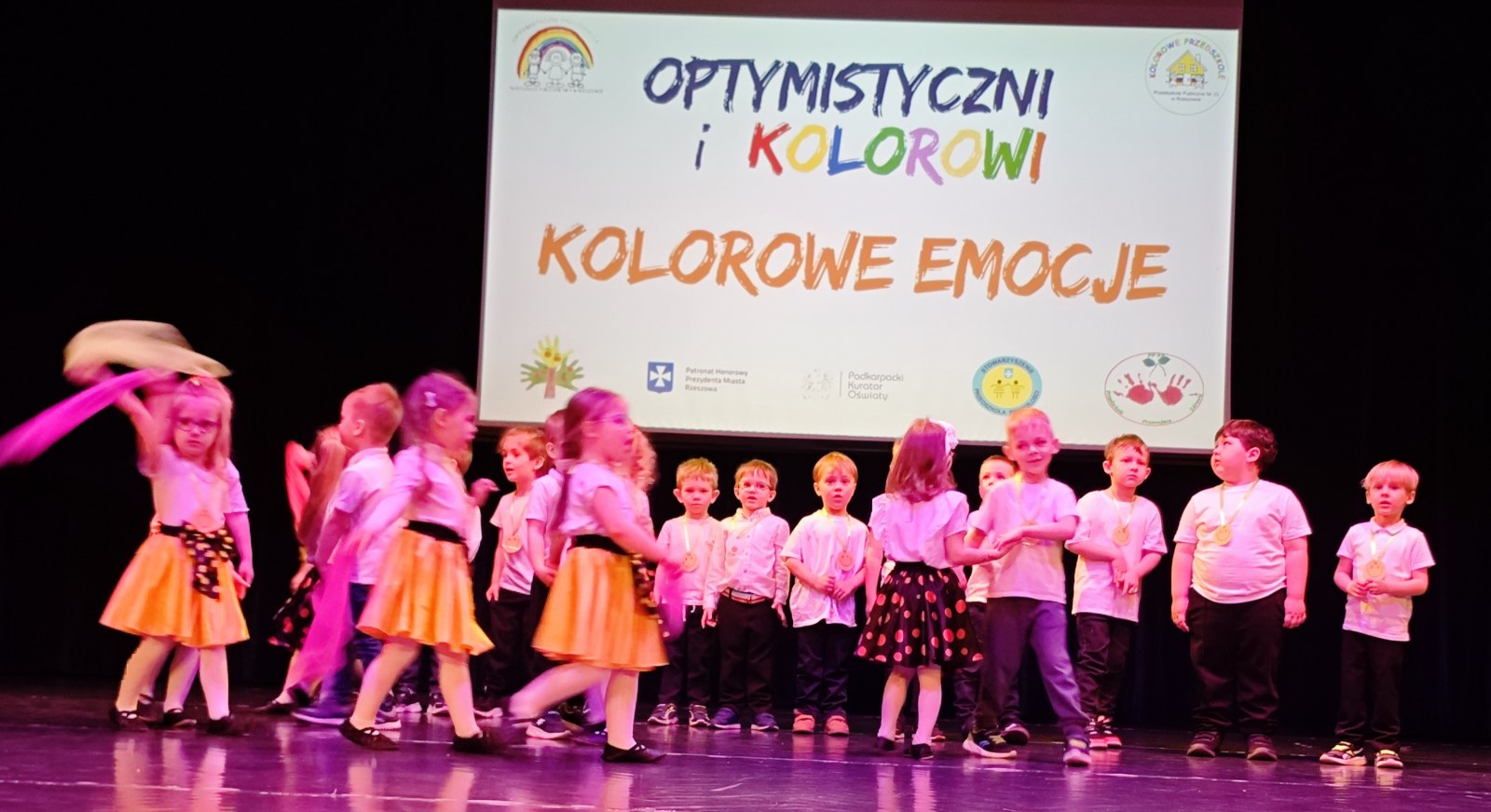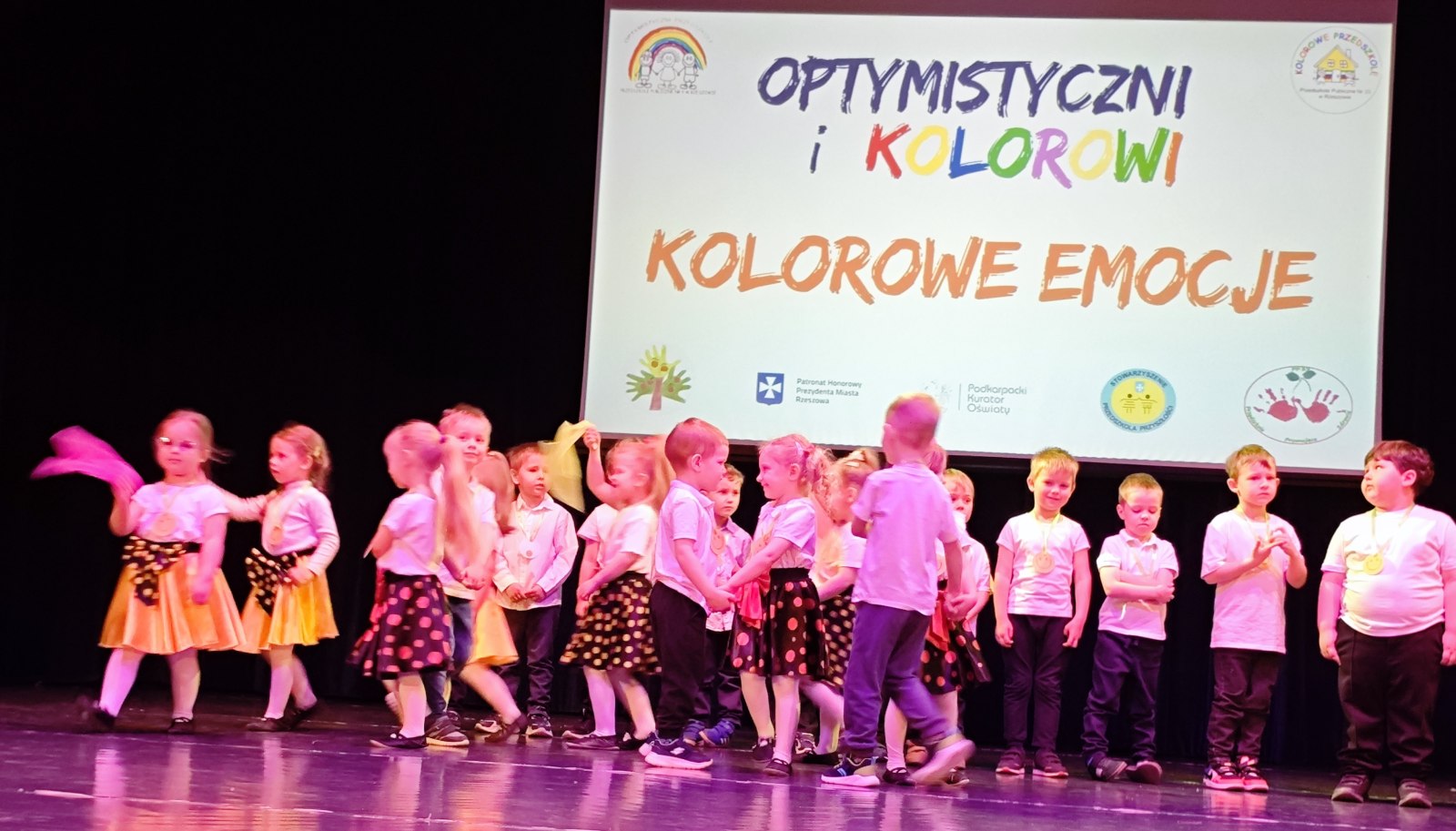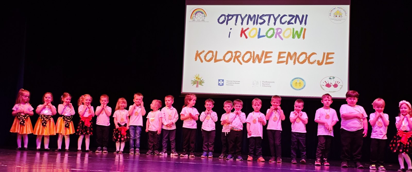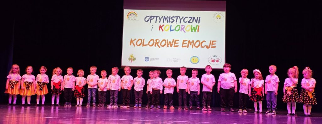 W piątek, 17 kwietnia – BIEDRONKI z gr. II wzięły udział w przeglądzie artystycznym „Optymistyczni i Kolorowi”. Ta coroczna impreza dla rzeszowskich przedszkolaków ma na celu przede wszystkim promowanie radości, rozwijanie optymizmu, kreatywności, budowanie więzi oraz edukację zdrowotną i ekologiczną, i skupia się na ich występach wokalnych i tanecznych. Tegoroczna, XII już edycja przeglądu odbyła się pod hasłem „KOLOROWE EMOCJE”.