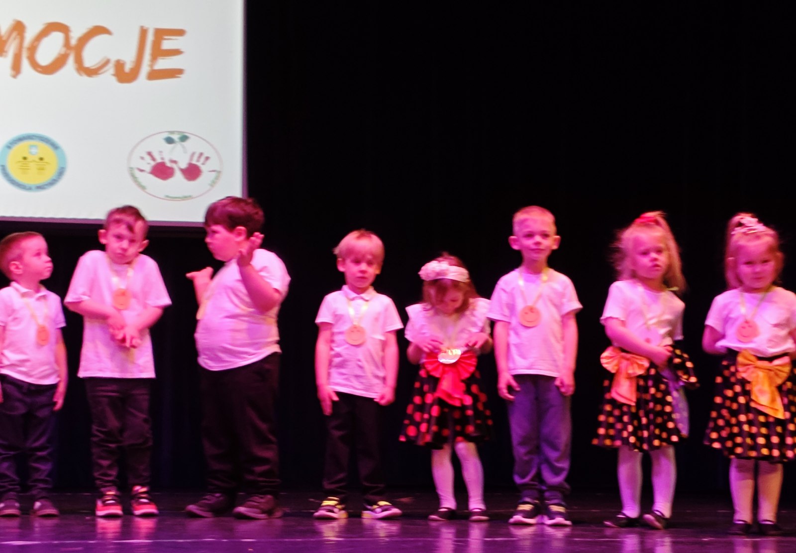 Nasze BIEDRONKI, przygotowane przez p. Magdalenę Haluch, zaprezentowały wiersz „Emocje” oraz wykonały układ taneczny do piosenki „Co czuję dziś”. I pomimo, że były najmłodszymi uczestnikami przeglądu, wypadły znakomicie! Nic więc dziwnego, że za swój występ otrzymały gromkie brawa i szczere gratulacje!