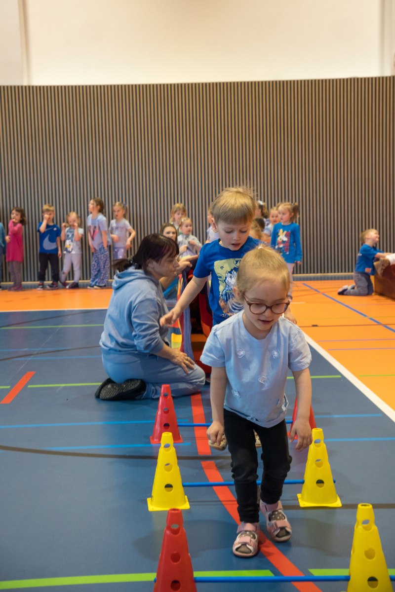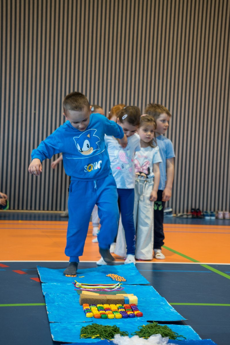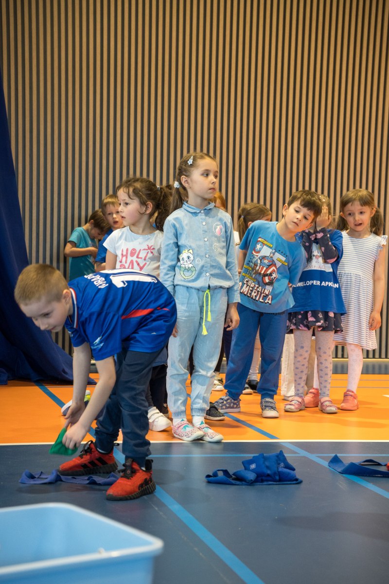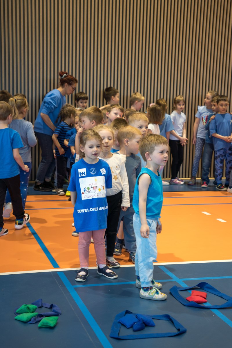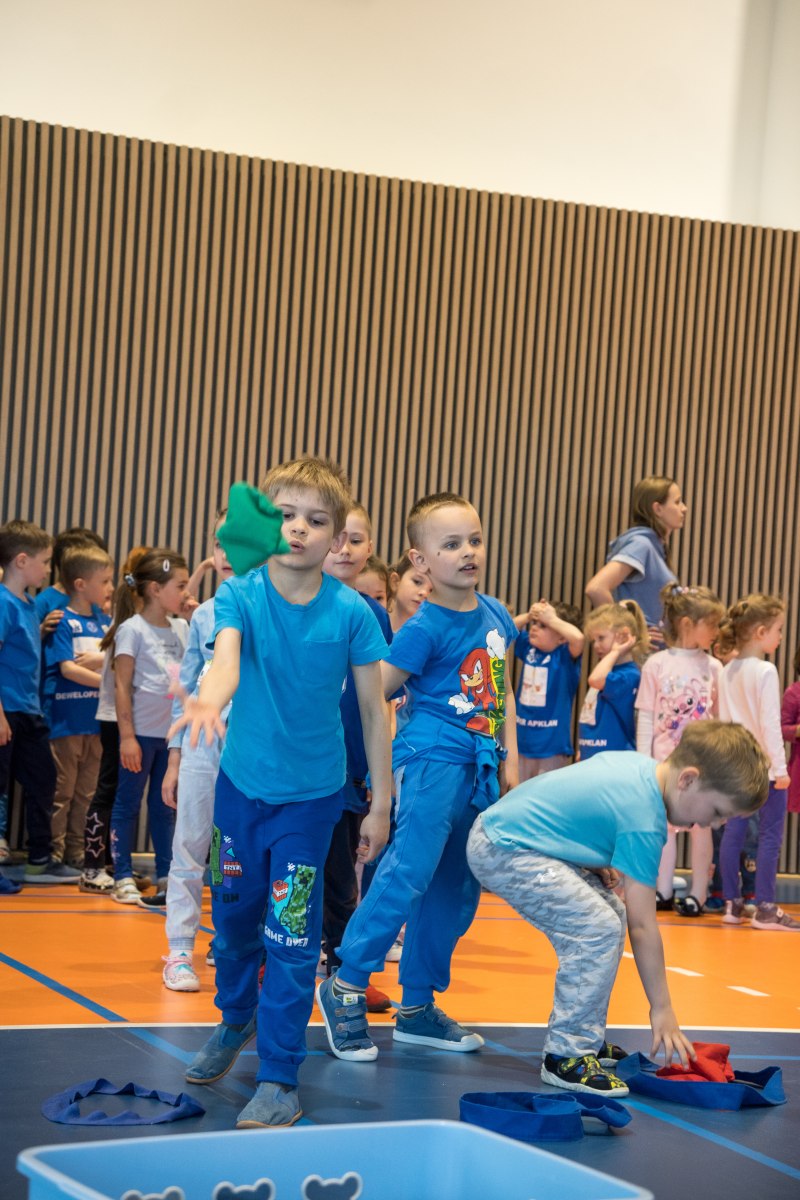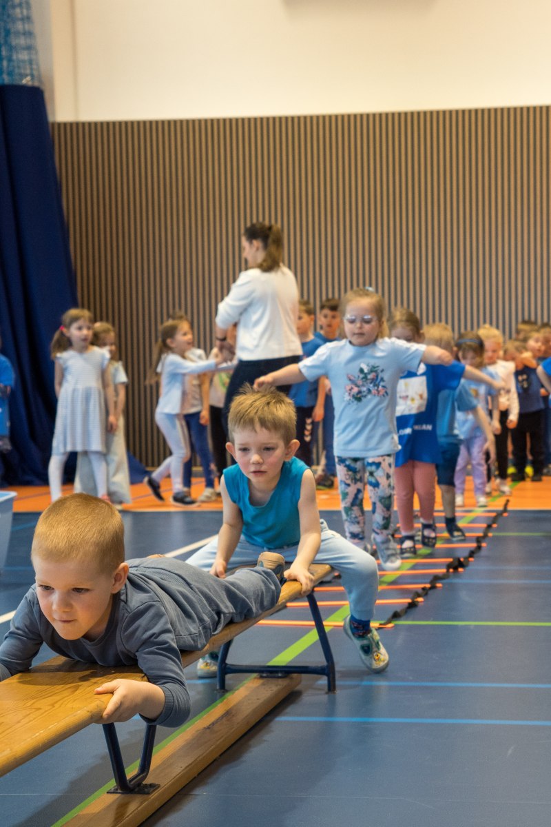 Na uczestników czekało pięć różnorodnych stacji sportowych, które każda grupa pokonywała z ogromnym zaangażowaniem. Wśród konkurencji znalazły się m.in. niebieski slalom, ścieżka sensoryczna, rzuty do celu, „podłoga to lawa” oraz tor przeszkód. Za wykonanie każdego zadania dzieci otrzymywały pieczątki, a skompletowanie wszystkich było dla nich powodem do dumy i oznaczało zdobycie tytułu prawdziwego „niebieskiego sportowca”.