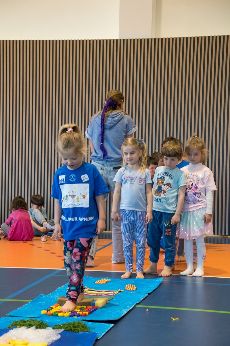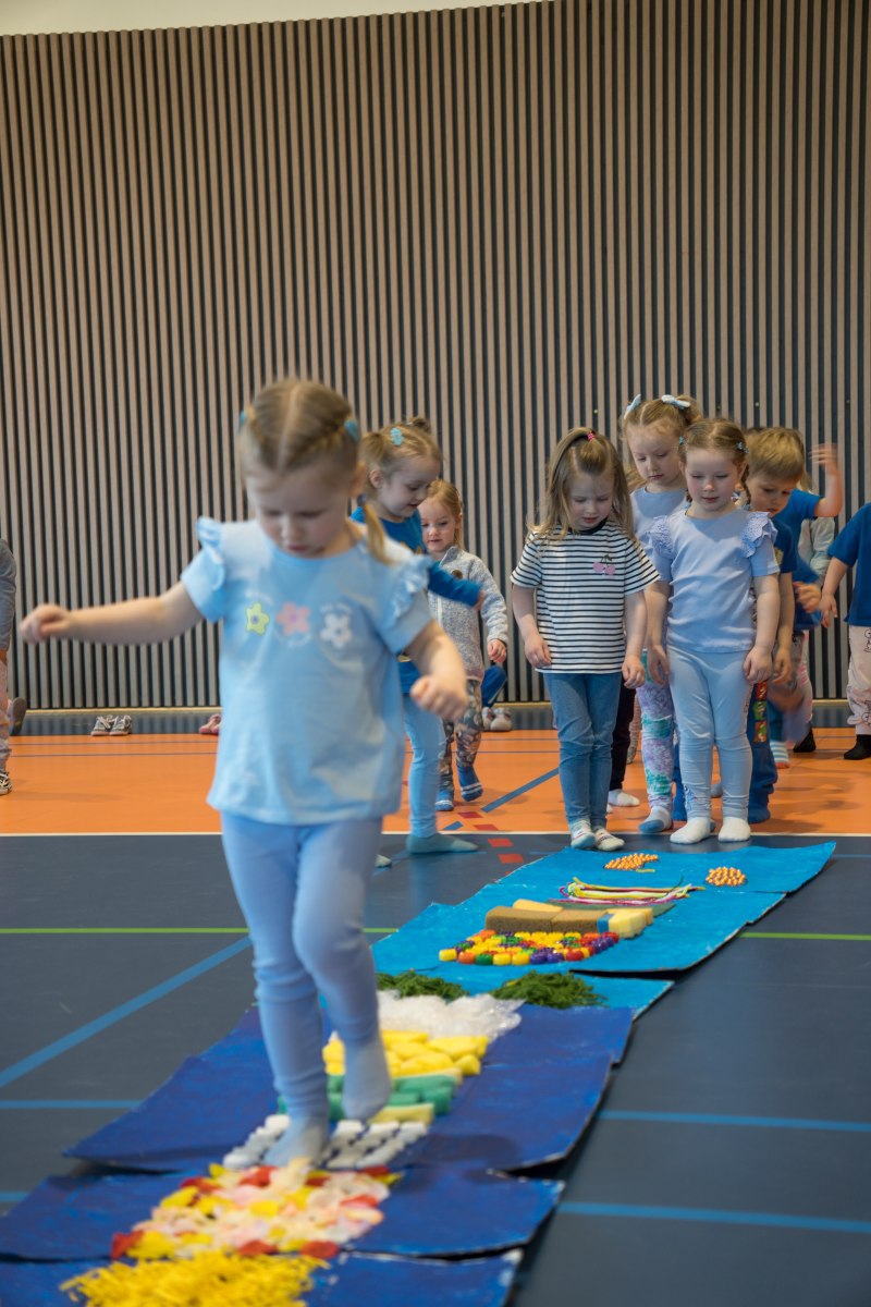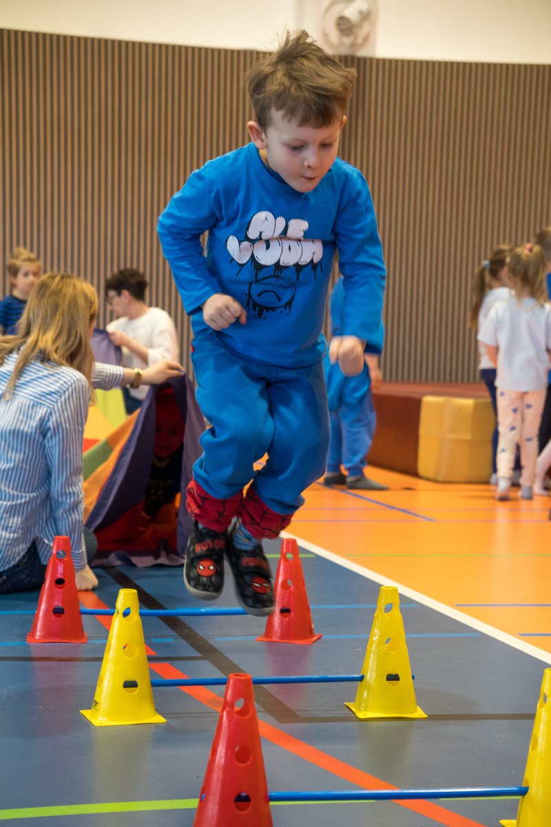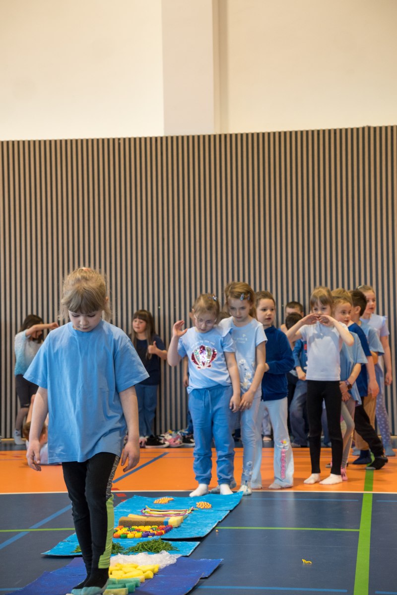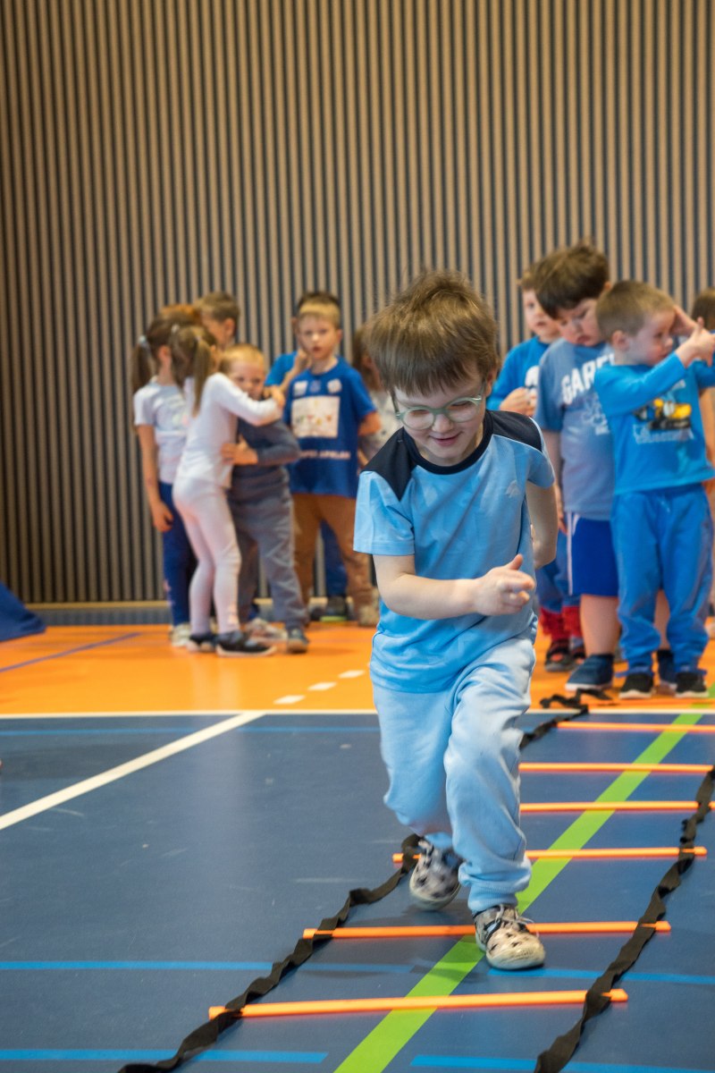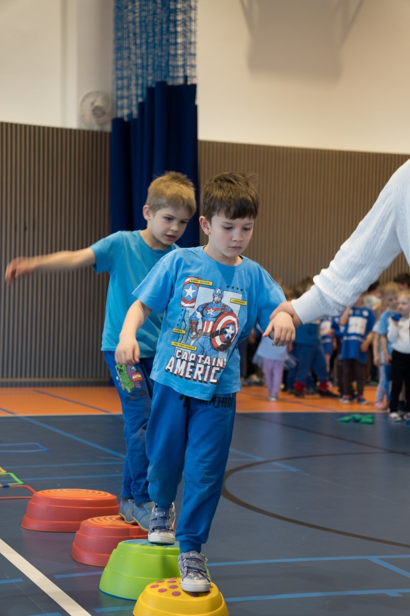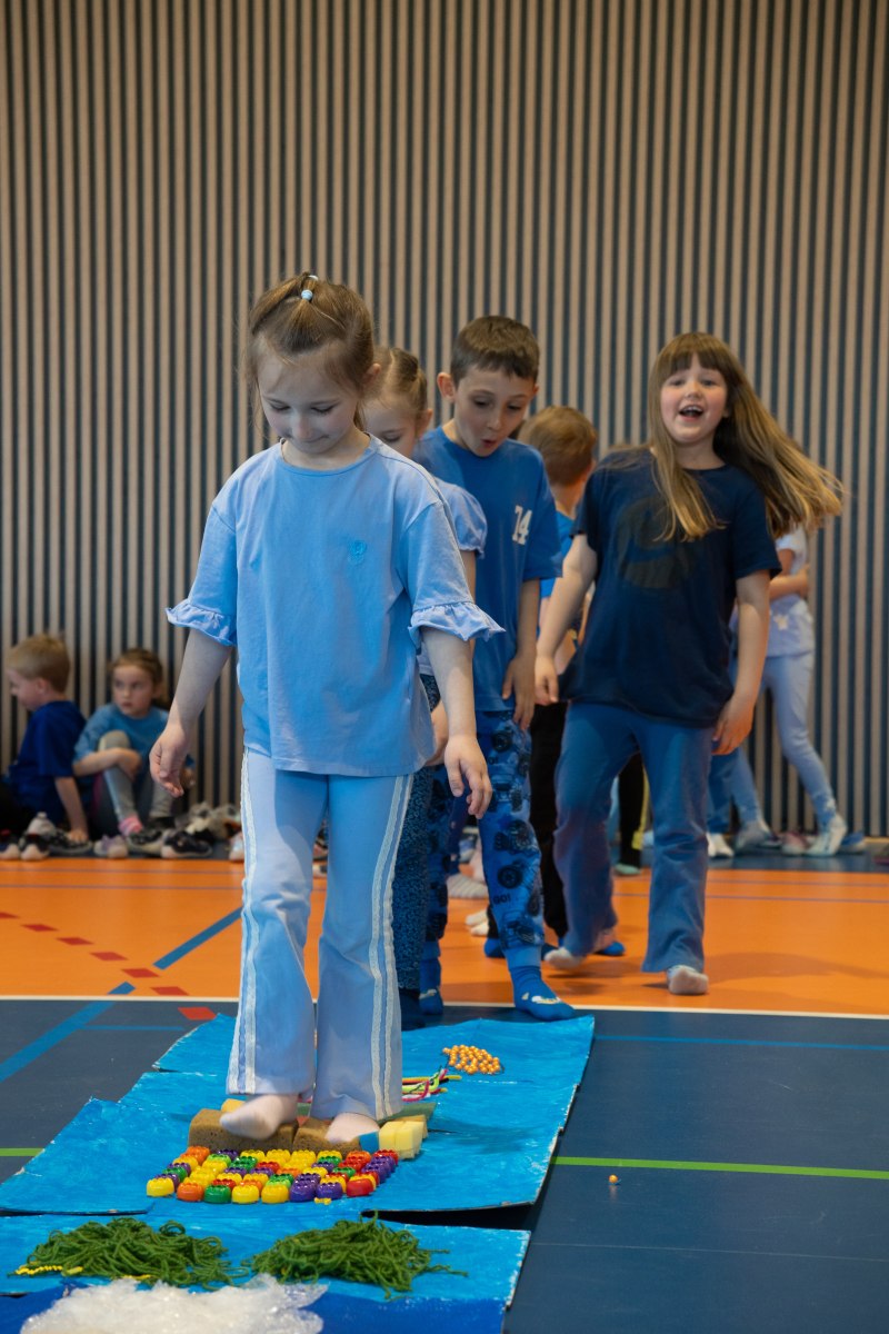 Na uczestników czekało pięć różnorodnych stacji sportowych, które każda grupa pokonywała z ogromnym zaangażowaniem. Wśród konkurencji znalazły się m.in. niebieski slalom, ścieżka sensoryczna, rzuty do celu, „podłoga to lawa” oraz tor przeszkód. Za wykonanie każdego zadania dzieci otrzymywały pieczątki, a skompletowanie wszystkich było dla nich powodem do dumy i oznaczało zdobycie tytułu prawdziwego „niebieskiego sportowca”.