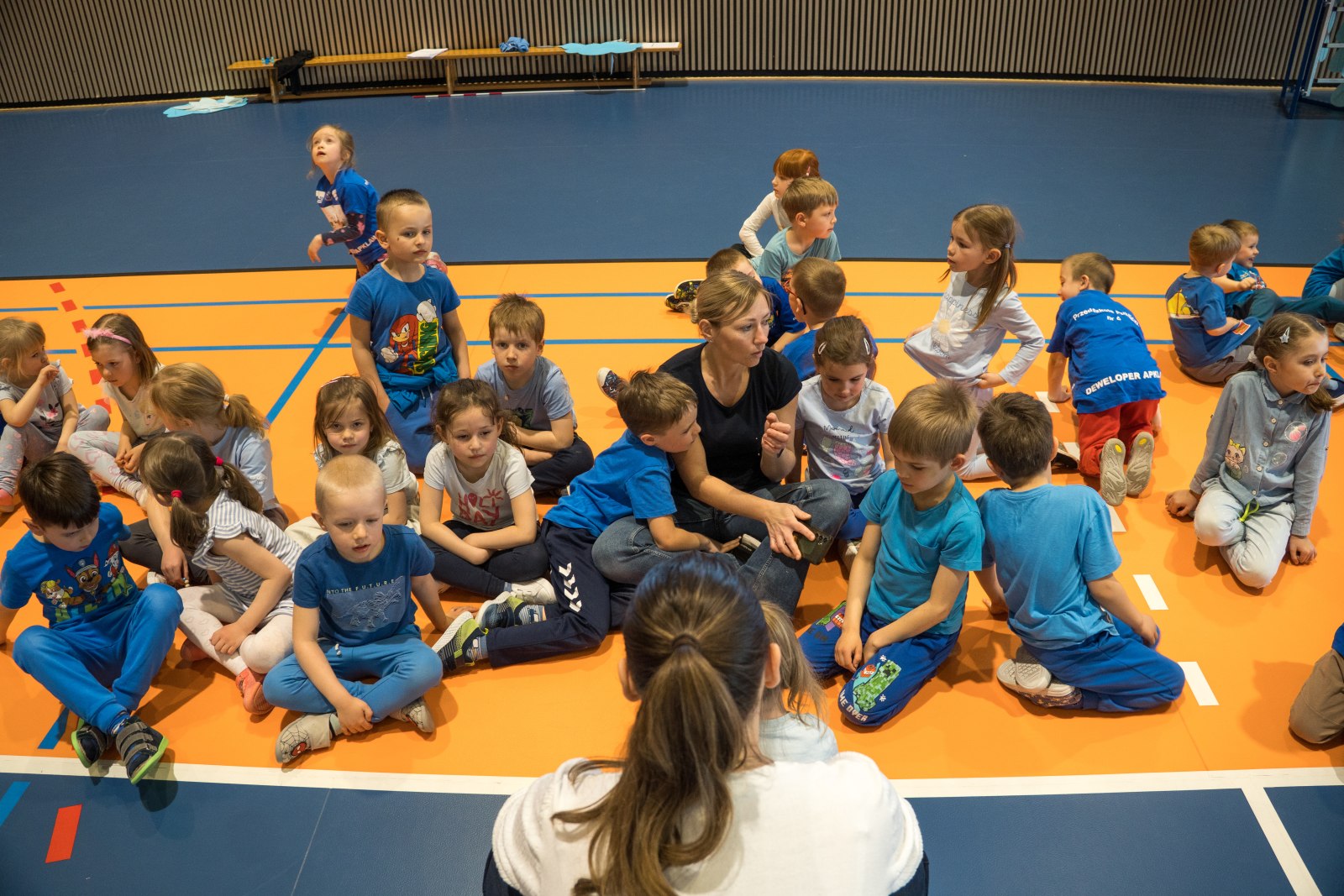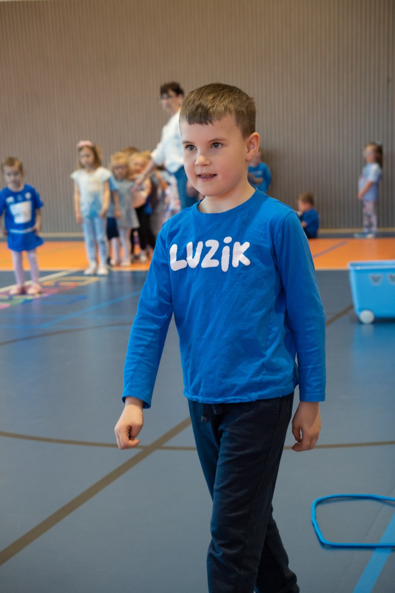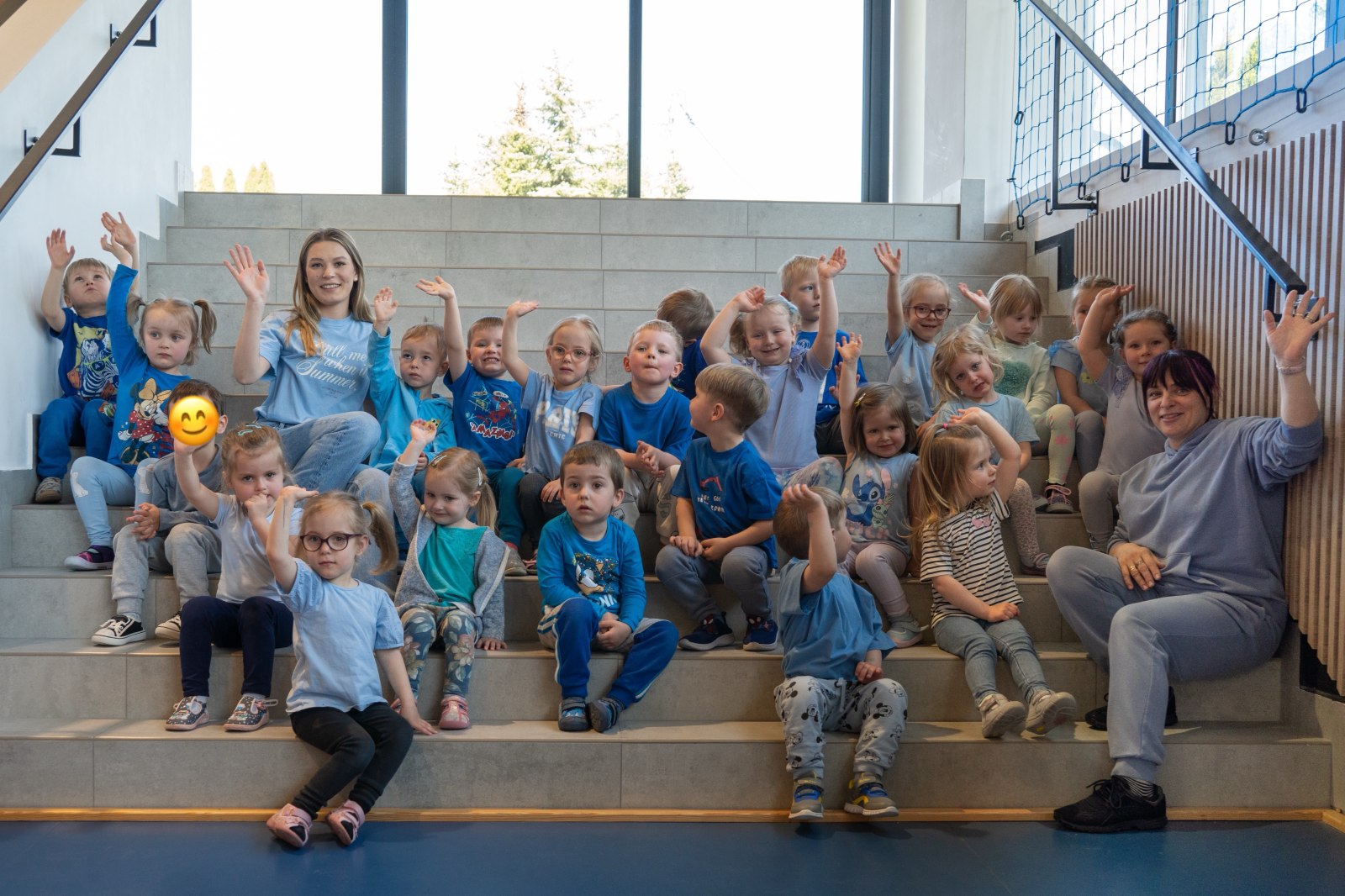 Tego dnia całe przedszkole przybrało niebieskie barwy – symbol solidarności z osobami w spektrum autyzmu. Dzieci rozpoczęły dzień od zajęć poświęconych tej tematyce, podczas których rozmawiały o różnorodności, empatii i wzajemnym szacunku. Następnie wszystkie grupy spotkały się na sali gimnastycznej, gdzie wspólnie odśpiewaliśmy Hymn Niebieskich Igrzysk, wprowadzając się w wyjątkową atmosferę wydarzenia.