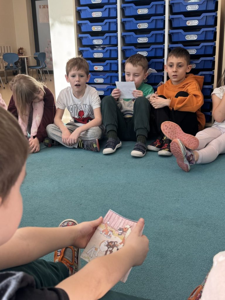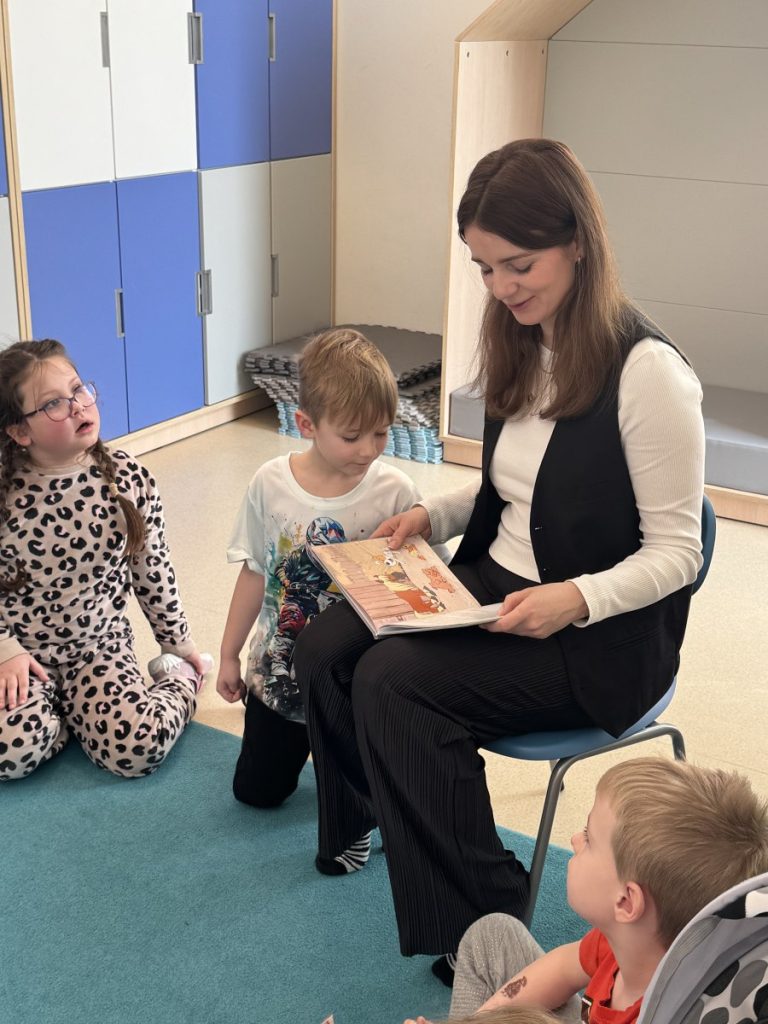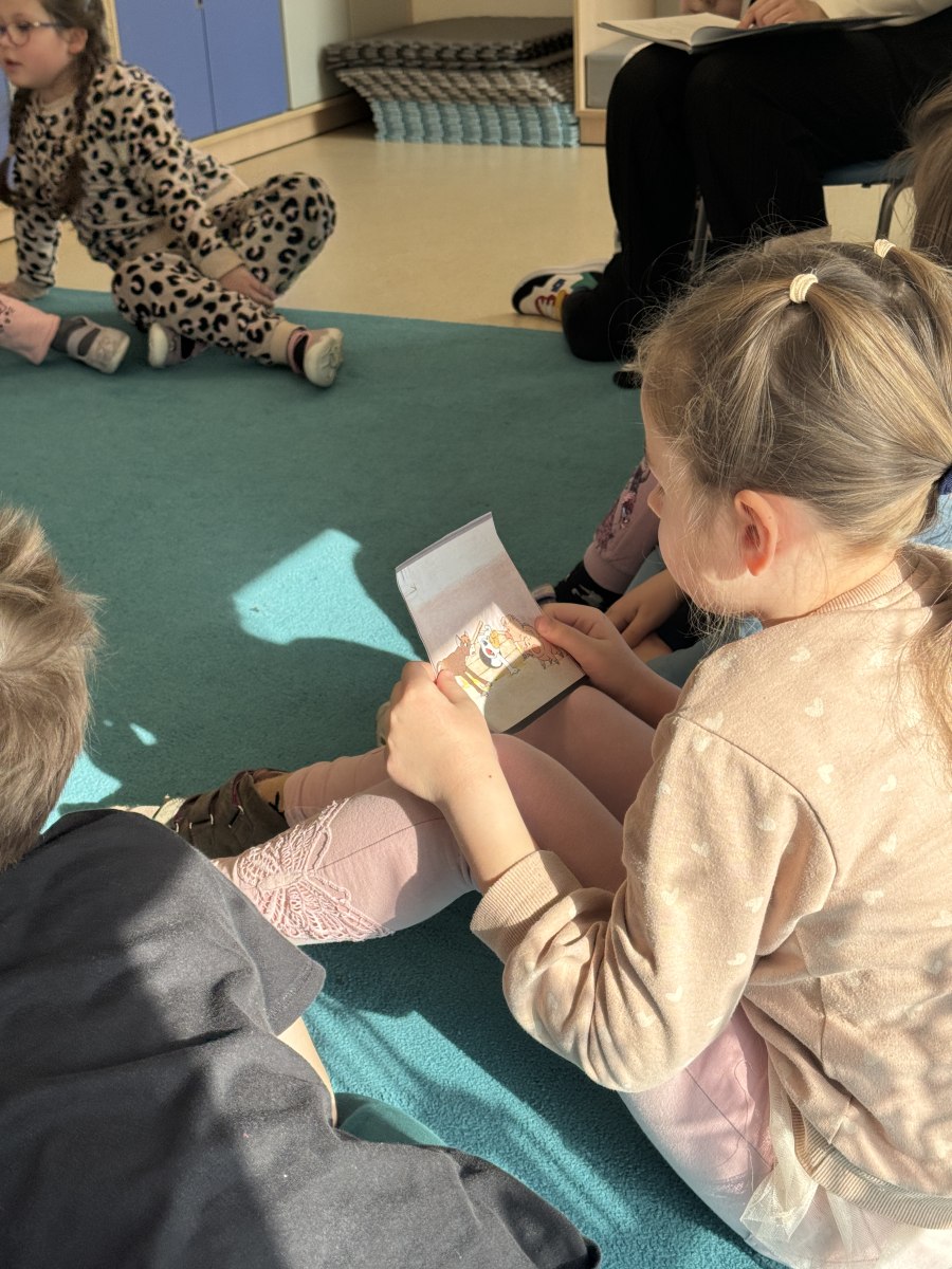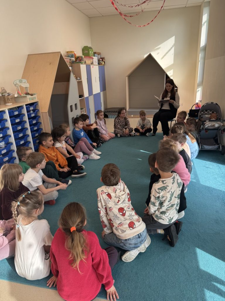 Dzieci z ogromnym zainteresowaniem wysłuchały czytanej opowieści, z zaciekawieniem oglądały ilustracje oraz chętnie odpowiadały na pytania dotyczące treści książeczki. Spotkanie przebiegło w bardzo miłej i ciepłej atmosferze.