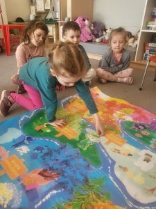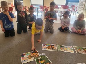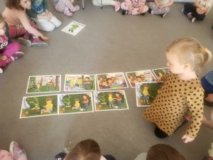 Na początku zajęć przedszkolaki wysłuchały opowiadania wprowadzającego w temat spotkania. Następnie uważnie przyglądały się ilustracjom, wyszukiwały je oraz układały w odpowiedniej kolejności, odtwarzając przebieg historii. Była to świetna okazja do ćwiczenia spostrzegawczości i wspólnej pracy.