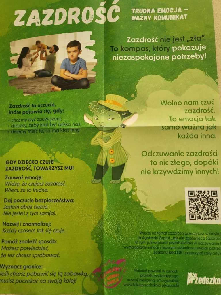 Podczas spotkania przedszkolaki poznały nowego bohatera – Pana Zielonka z Wyspy Zazdrości. Bohater ten uczy dzieci, że zazdrość jest emocją, którą zna każdy z nas. Dzięki jego historii dzieci dowiedziały się, że zazdrość nie musi prowadzić do konfliktów – może stać się motywacją do działania, rozwijania swoich umiejętności oraz dążenia do wyznaczonych celów.