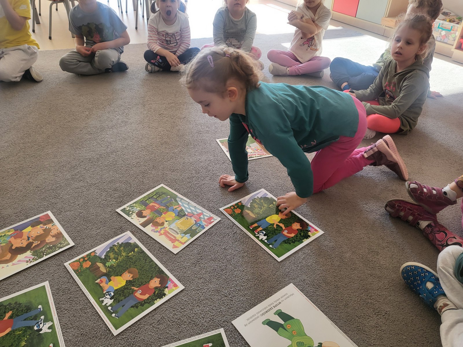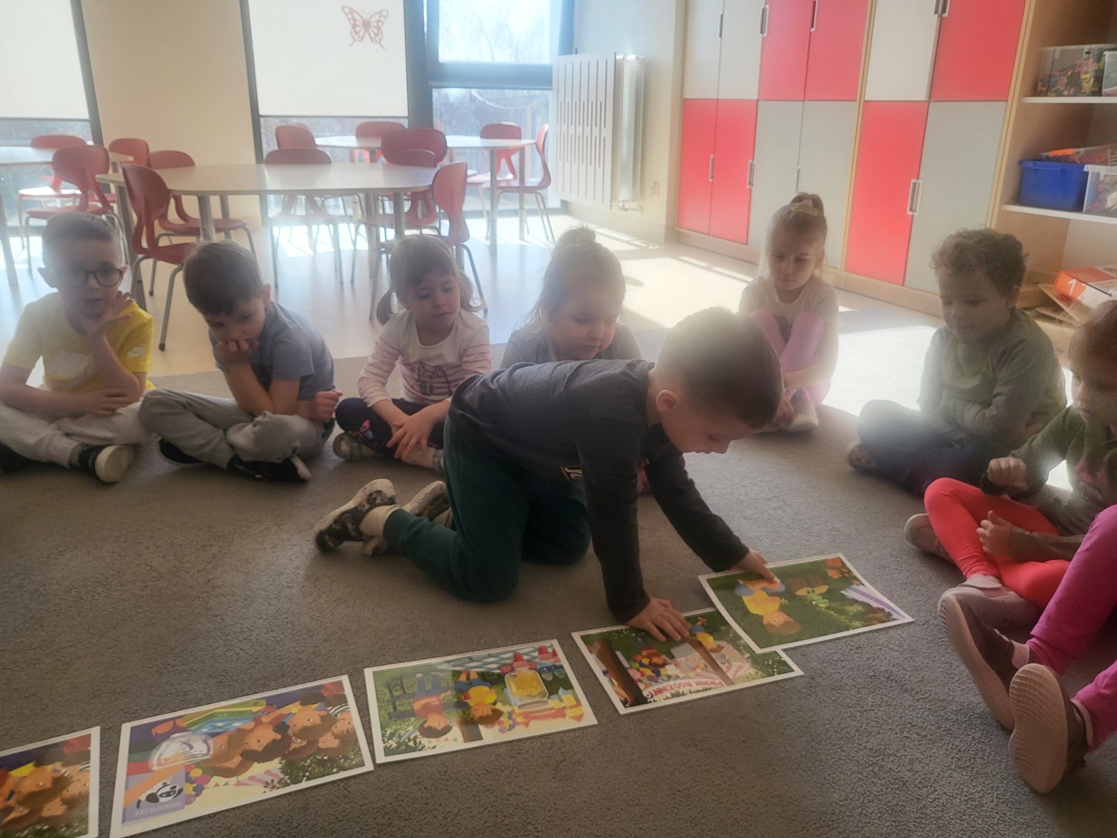 Na początku zajęć przedszkolaki wysłuchały opowiadania wprowadzającego w temat spotkania. Następnie uważnie przyglądały się ilustracjom, wyszukiwały je oraz układały w odpowiedniej kolejności, odtwarzając przebieg historii. Była to świetna okazja do ćwiczenia spostrzegawczości i wspólnej pracy.