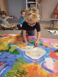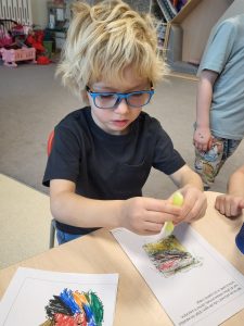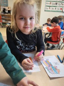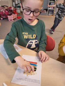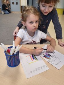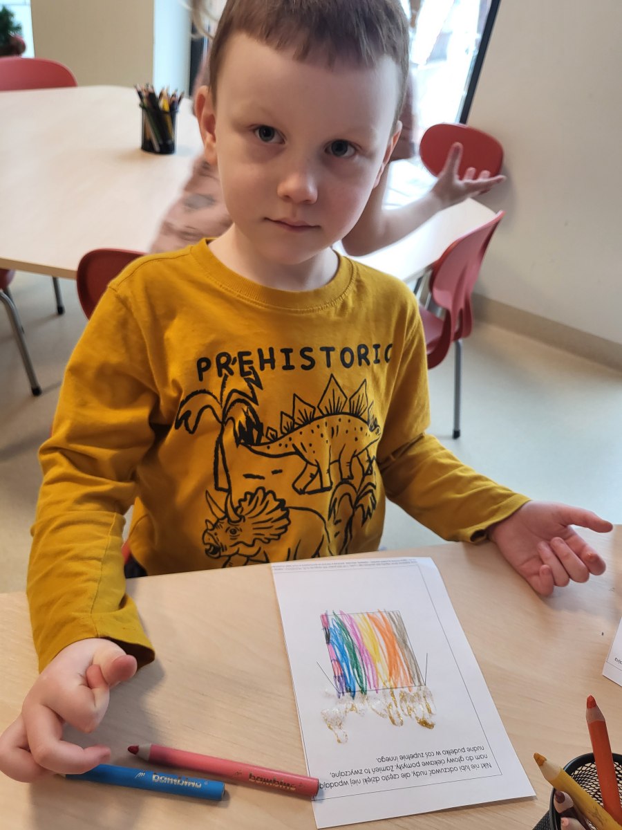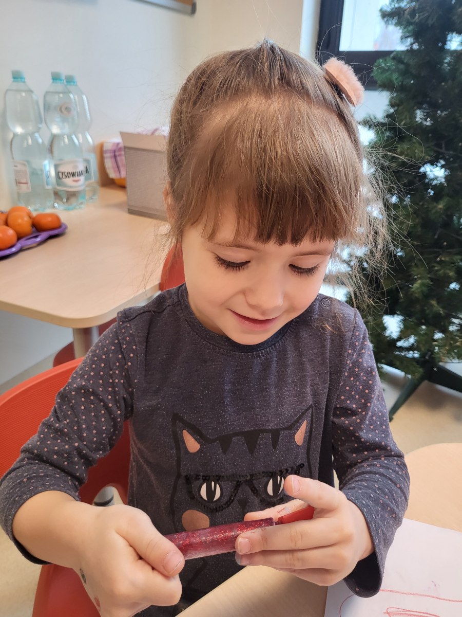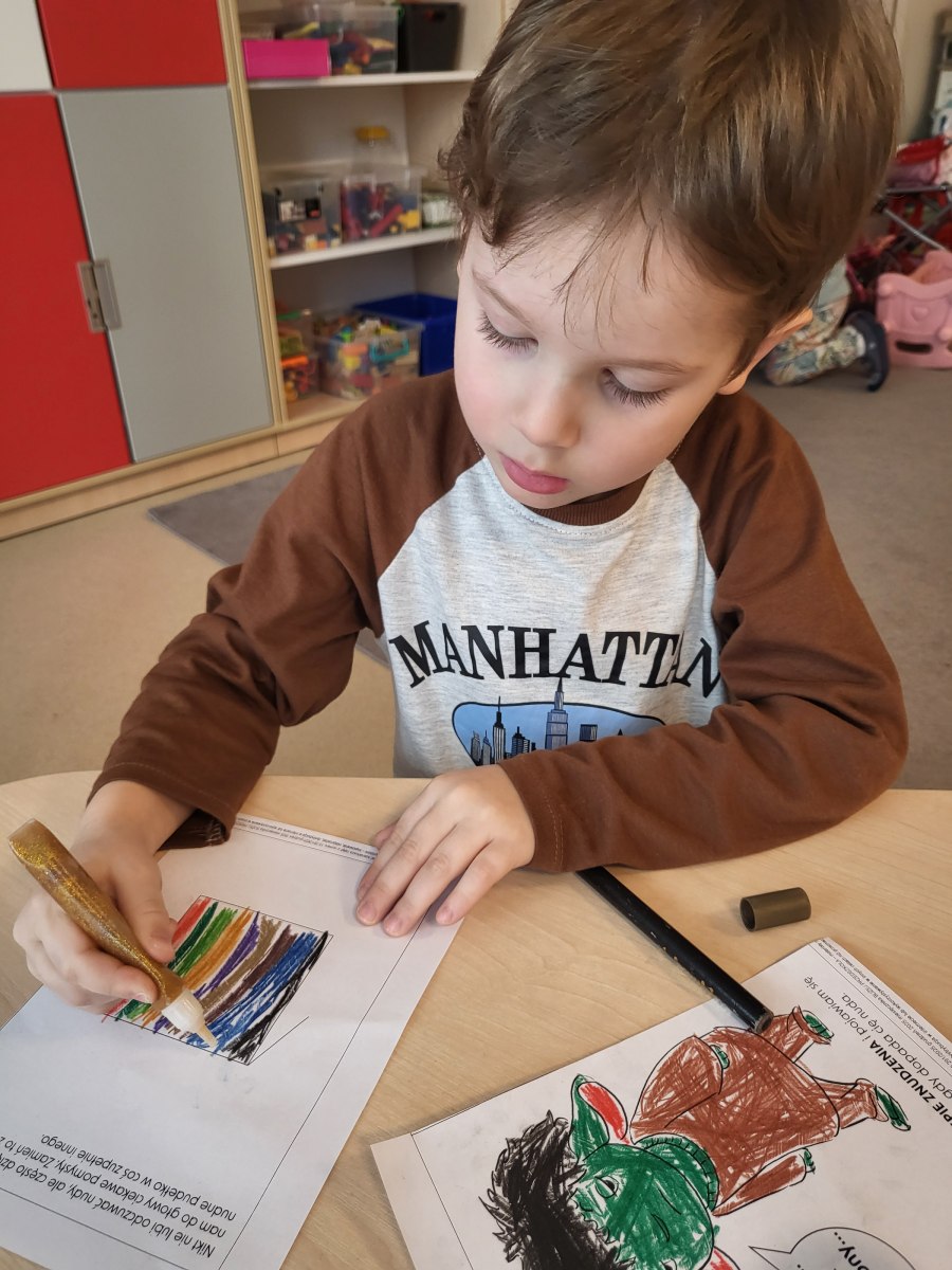 Dzieci wykonały też karty pracy – aby były niezwykłe, używaliśmy brokatu do zdobienia.