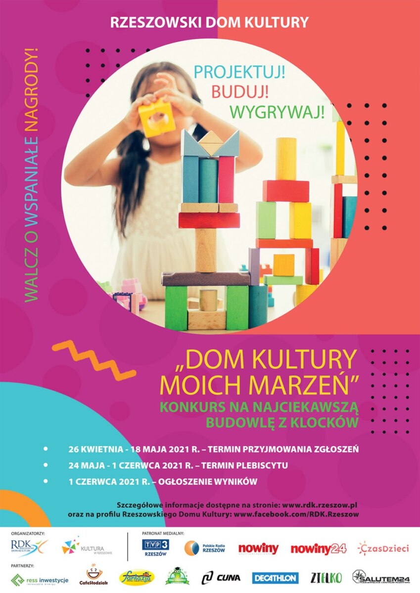 Rzeszowski Dom Kultury zaprasza przedszkolaki oraz wszystkie dzieci z Rzeszowa do wzięcia udziału w konkursie na najciekawszą budowlę z klocków „DOM KULTURY MOICH MARZEŃ”. Konkurs przeznaczony jest dla dzieci i rodziców oraz dla grup przedszkolnych.