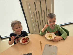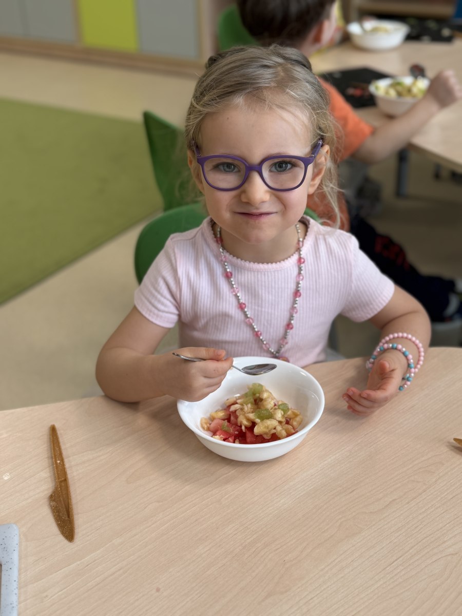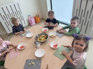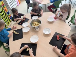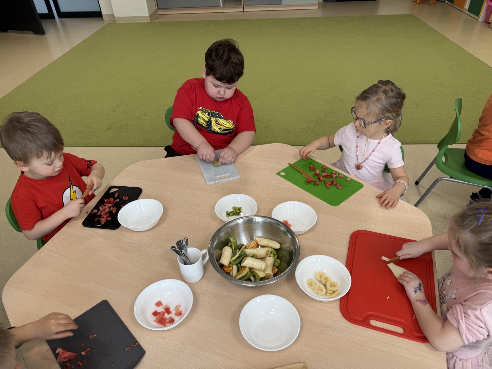 Dziś w grupie Biedronek odbyły się zajęcia kulinarne. Dzieci samodzielnie przygotowywały swoje drugie śniadanie – pyszną sałatkę owocową. Najpierw wspólnie rozmawialiśmy o owocach i o tym, dlaczego warto jeść je każdego dnia. Następnie dzieci z wielkim zaangażowaniem kroiły i mieszały przygotowane owoce, tworząc kolorowe i zdrowe sałatki.