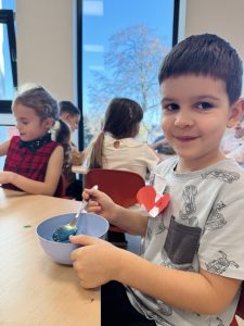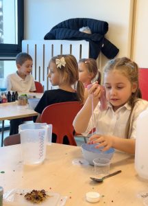 W piątek, 7 listopada, grupa „Sówki” wzięła udział w kreatywnych warsztatach, podczas których dzieci tworzyły swoje własne, kolorowe slimy! Pod okiem instruktora z firmy „Kreatywny Świat Dziecka” przedszkolaki dobierały barwy oraz brokaty, a następnie mieszały składniki, obserwując, jak powstaje elastyczna, rozciągliwa masa.