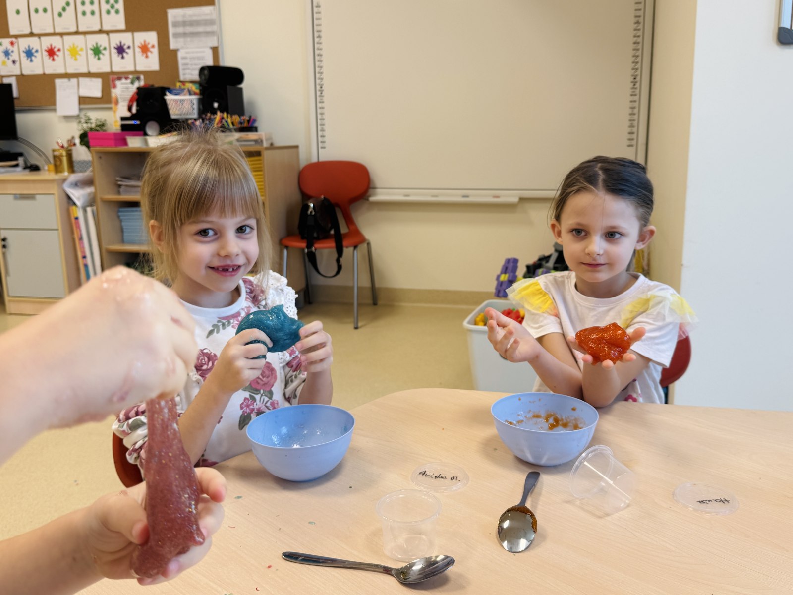 W piątek, 7 listopada, grupa „Sówki” wzięła udział w kreatywnych warsztatach, podczas których dzieci tworzyły swoje własne, kolorowe slimy! Pod okiem instruktora z firmy „Kreatywny Świat Dziecka” przedszkolaki dobierały barwy oraz brokaty, a następnie mieszały składniki, obserwując, jak powstaje elastyczna, rozciągliwa masa.