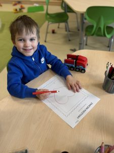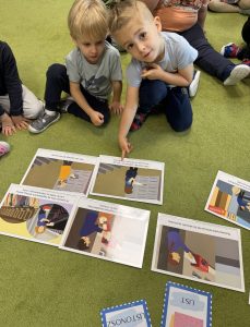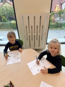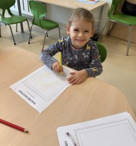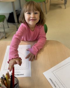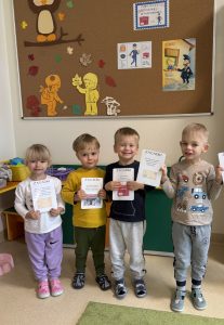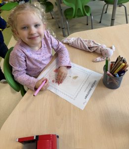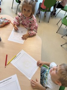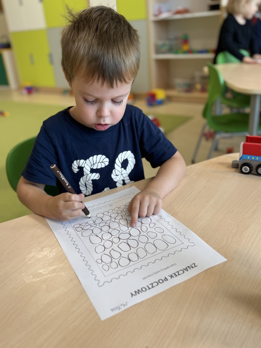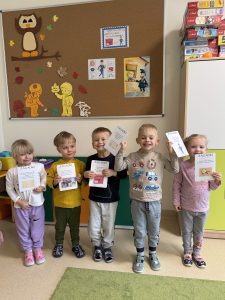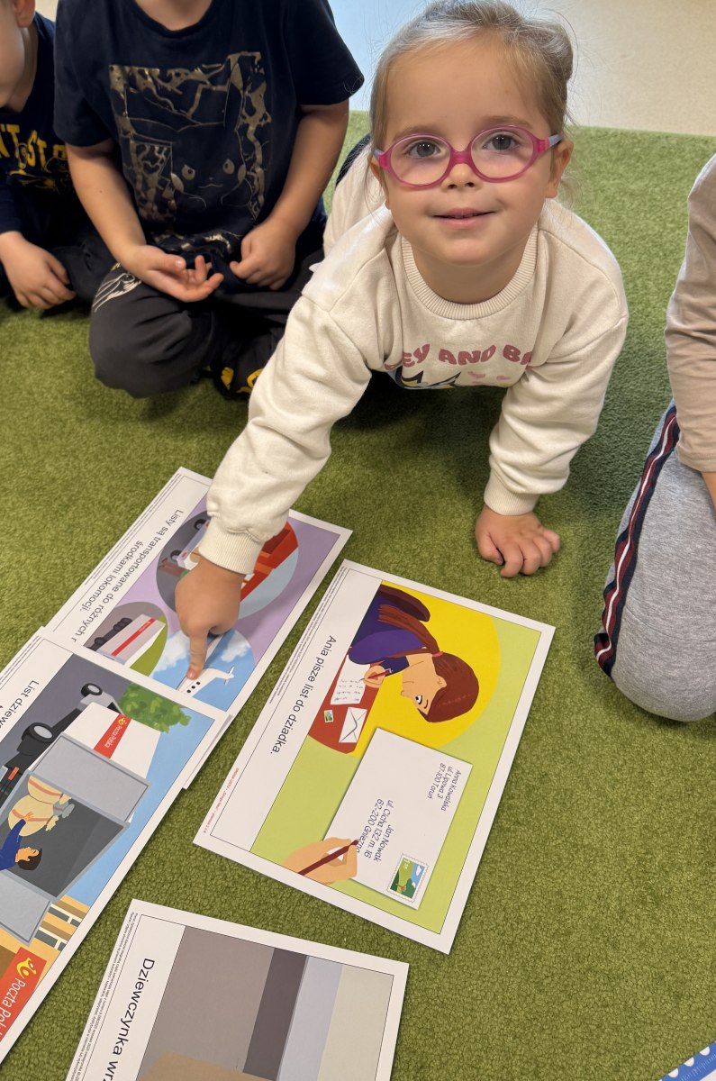 Podczas zajęć dzieci tworzyły własne kartki dla bliskich oraz projektowały znaczki pocztowe. Nie zabrakło również zabaw edukacyjnych – Biedronki szukały pasujących par oraz wskazywały, które przedmioty nie pasują do wyposażenia listonosza.
