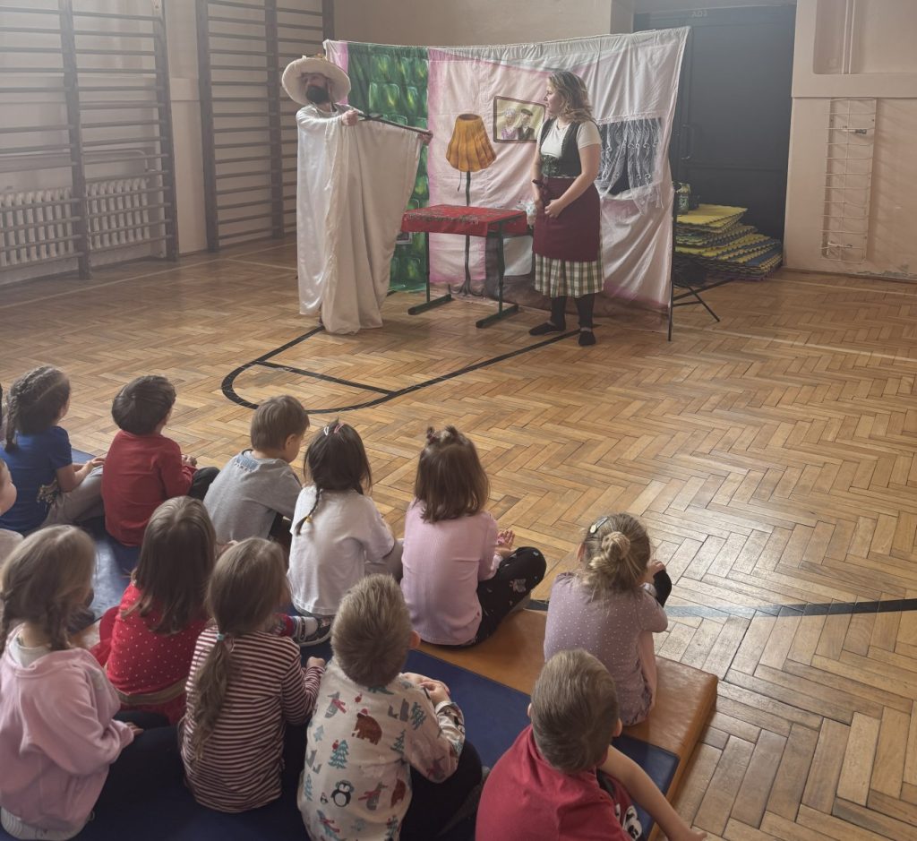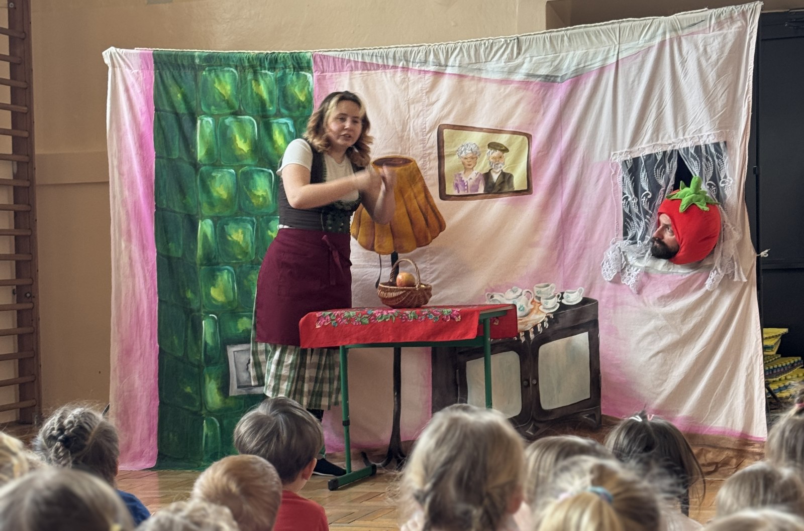 Wszystkie dzieci z ogromnym zainteresowaniem obejrzały przedstawienie oparte na twórczości Jana Brzechwy. Aktorzy w barwny i pełen humoru sposób zaprezentowali inscenizacje do znanych i lubianych wierszy, takich jak: „Entliczek-pentliczek”, „Pomidor”, „Kłamczucha”, „Grzyby” oraz „Na straganie”.