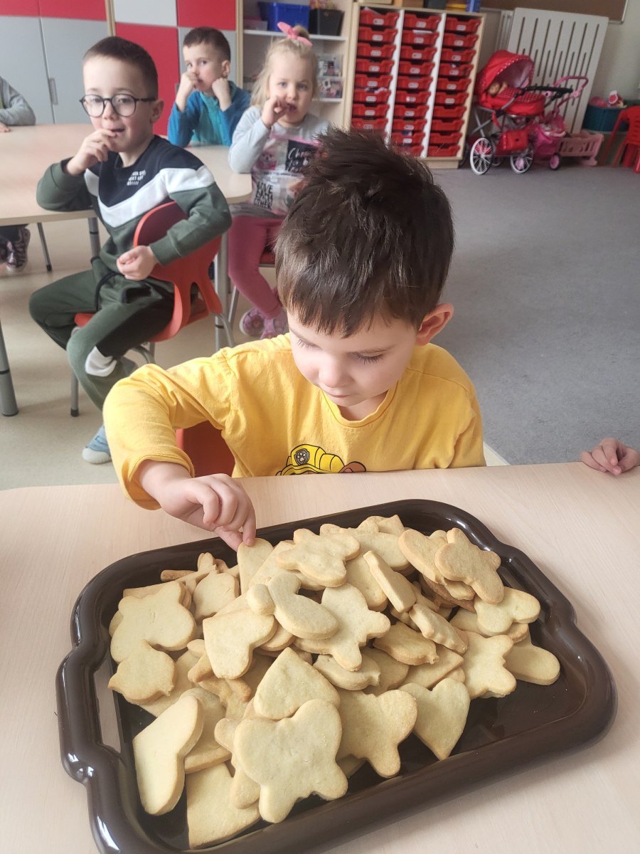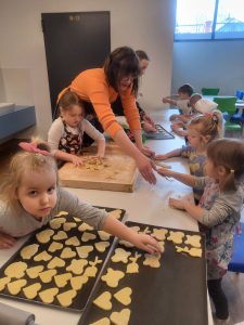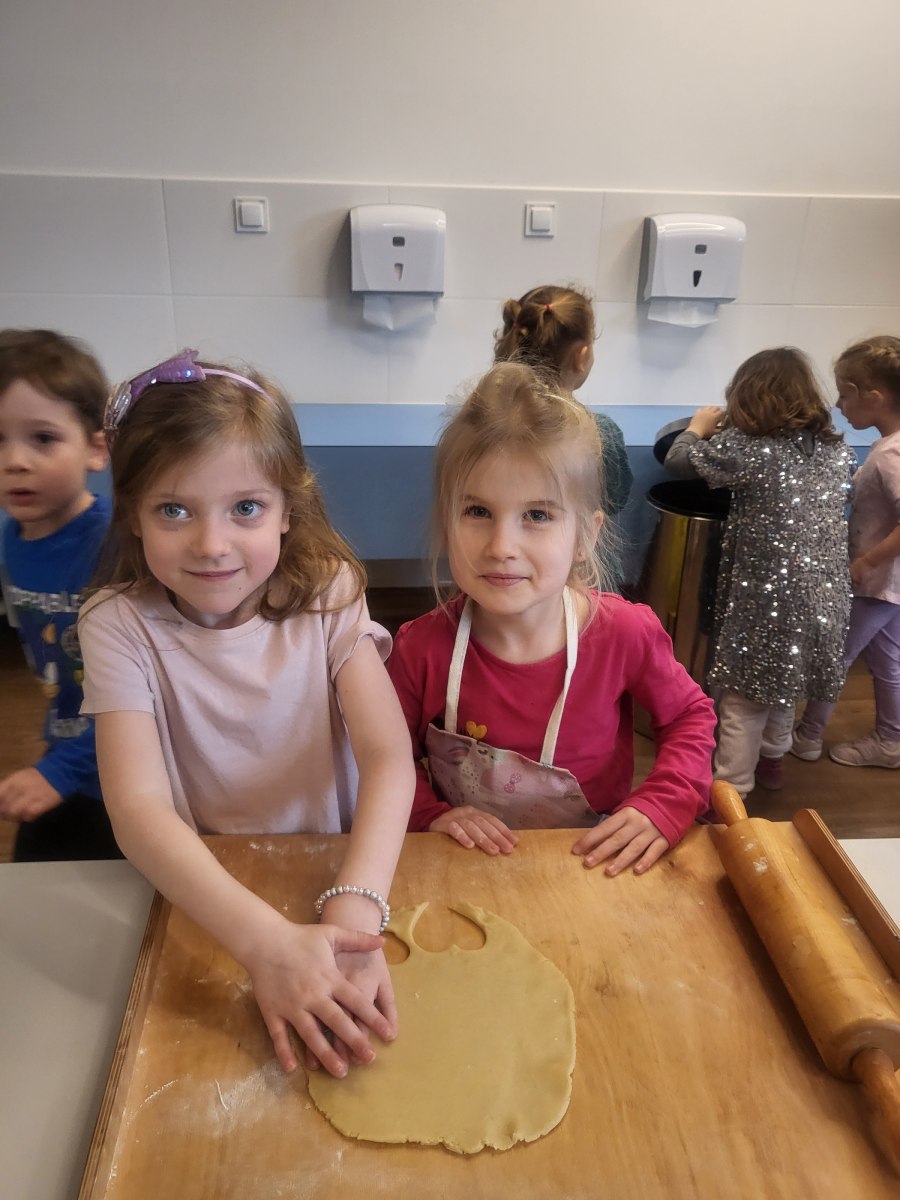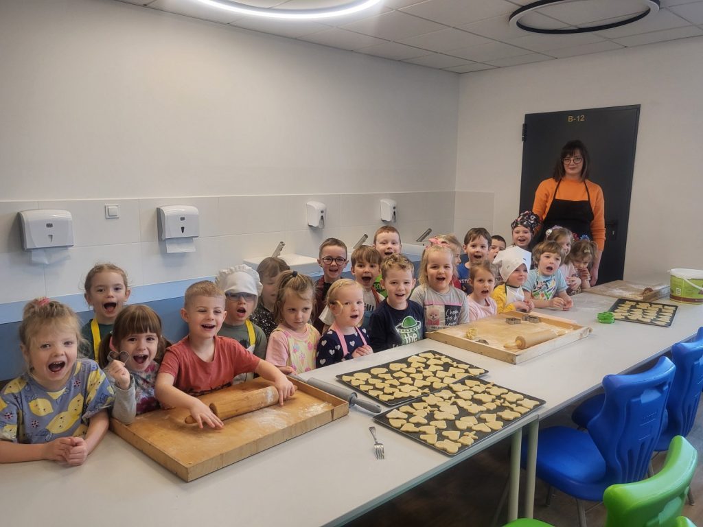 27 stycznia odwiedził nas niezwykły gość – pani Edyta Hołówko, która prowadzi cukiernię „Słodkie Kalorie” w Rzeszowie, a prywatnie jest mamą Elizy. Wizyta pani Edyta zamieniła się w prawdziwe warsztaty ciasteczkowe. Dzieci wyrabiały ciasto, wykrajały ciastka foremkami ćwicząc motorykę małą, ucząc się przy tym zasad higieny i podstawowych technik wypieku. Wszyscy się świetnie bawili przy pracy, a ciasteczka wyszły przepyszne.