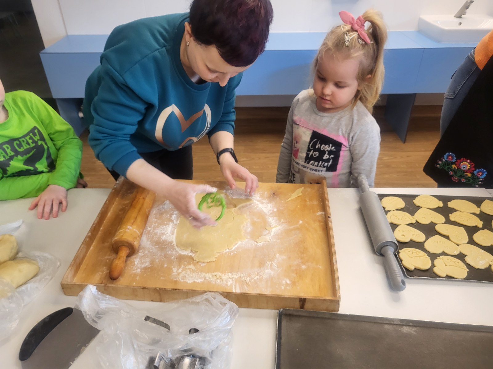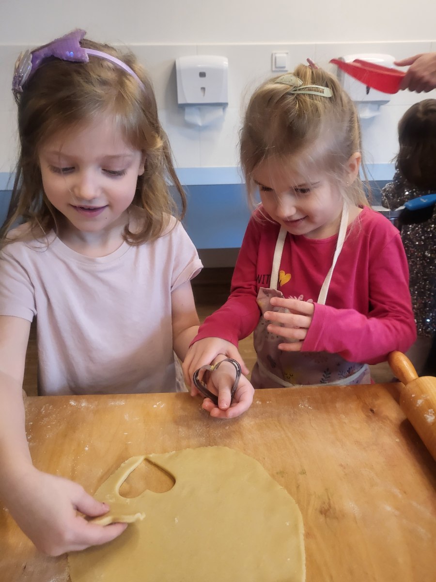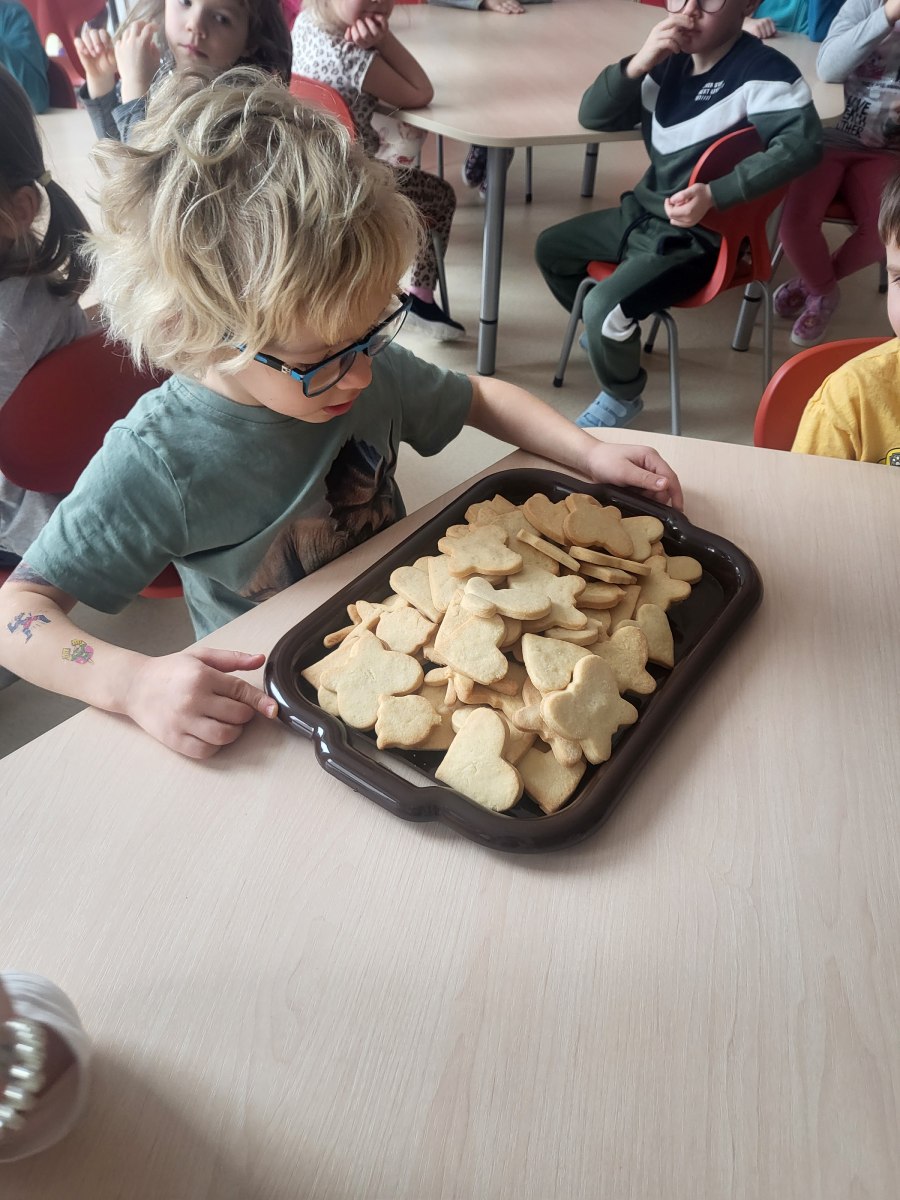 27 stycznia odwiedził nas niezwykły gość – pani Edyta Hołówko, która prowadzi cukiernię „Słodkie Kalorie” w Rzeszowie, a prywatnie jest mamą Elizy. Wizyta pani Edyta zamieniła się w prawdziwe warsztaty ciasteczkowe. Dzieci wyrabiały ciasto, wykrajały ciastka foremkami ćwicząc motorykę małą, ucząc się przy tym zasad higieny i podstawowych technik wypieku. Wszyscy się świetnie bawili przy pracy, a ciasteczka wyszły przepyszne.