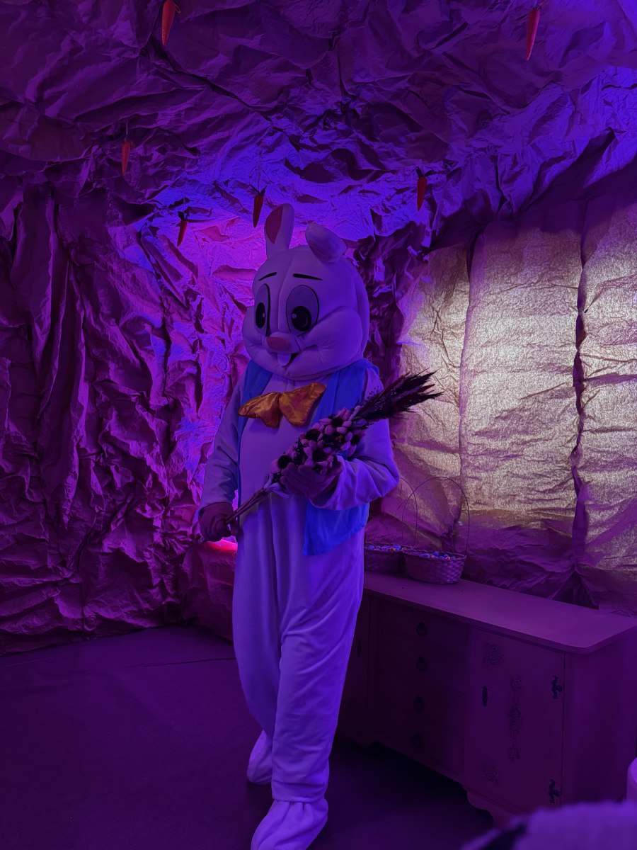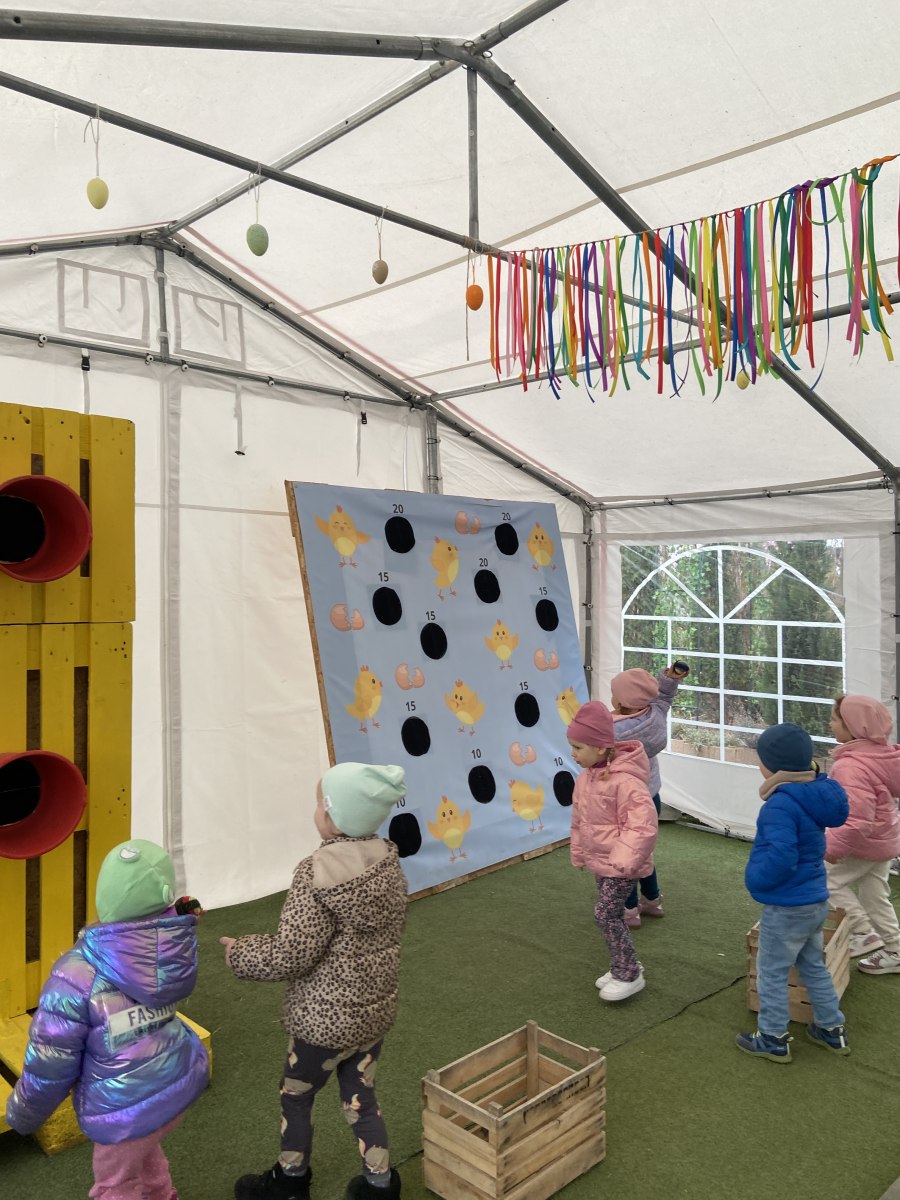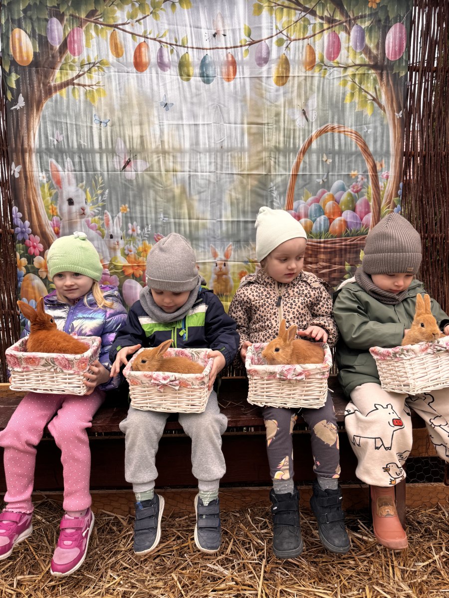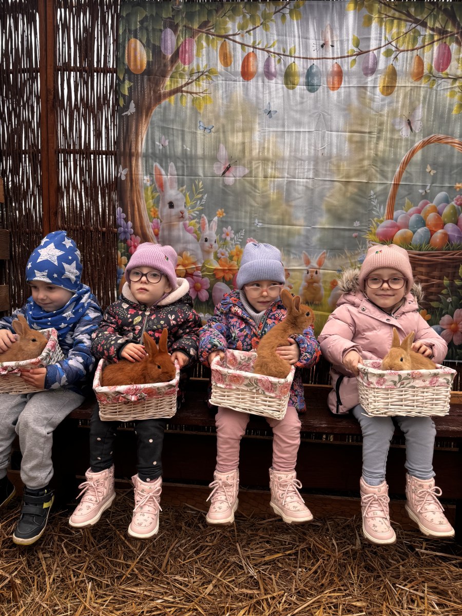 Podczas wizyty przedszkolaki poznały tradycje wielkanocne, o których opowiedział im Zajączek i uczestniczyły w różnych grach i zabawach, które dostarczyły im wiele radości i śmiechu.